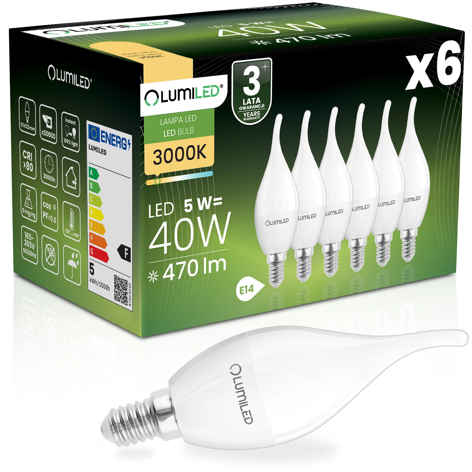 Sada 6x 5W LED žárovek značky Lumiled je ideální volbou pro ty, kteří hledají energeticky úsporné a přitom příjemné osvětlení do domácnosti. Vyzařuje teplou barvu 3000K, která vytváří útulnou atmosféru a je ideální pro obývací pokoj, ložnici nebo jídelnu. Patice BA35 ve tvaru svíčky E14 se hodí do nástěnných svícnů, lustrů a dekorativních lamp. Světelný tok 470 lm poskytuje jasné a příjemné světlo na úrovni tradiční 40W žárovky a úhel vyzařování 180° účinně osvětluje prostor bez oslnění.