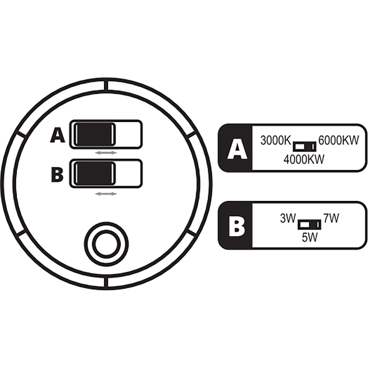 Svítidlo je vybaveno praktickým systémem CCT, který umožňuje nastavit světlo ještě před instalací. Pomocí přepínače A můžete zvolit jednu ze tří barevných teplot a přizpůsobit tak osvětlení charakteru interiéru: