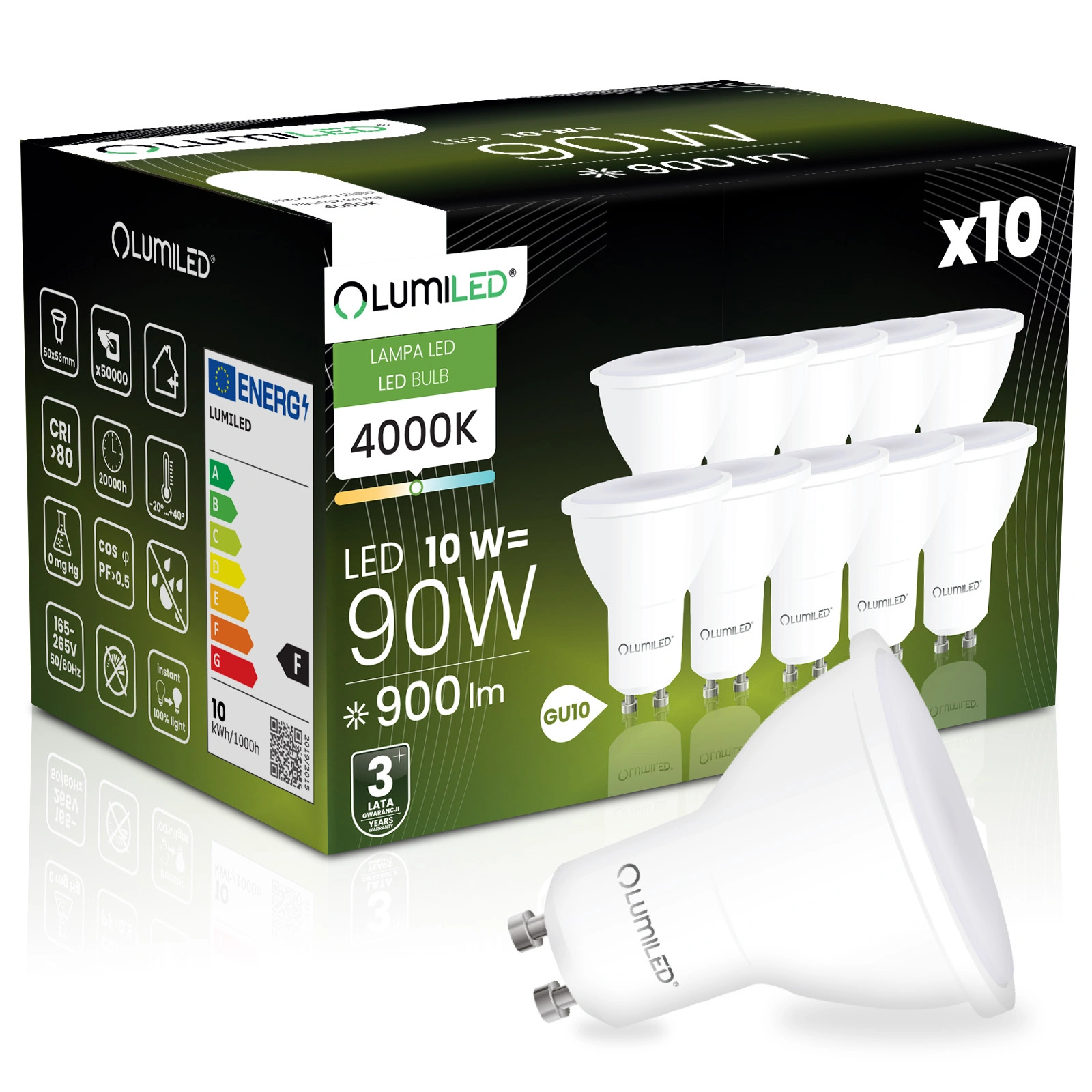 Sada 10x LED žárovek od renomované značky LUMILED s paticí GU10 a výkonem 10 W je vynikající náhradou za tradiční 90W žárovky a nabízí úsporu energie a delší životnost. Vyzařuje světlo se světelným tokem 900 lumenů a neutrální barvou 4000 K, takže je ideální pro osvětlení interiérů, kde je požadována jasná a přirozená barva světla. Úhel svícení 120° umožňuje široký rozptyl světla a účinně osvětluje místnost. Díky kvalitnímu zpracování má životnost až 15 000 hodin, což znamená mnoho let používání. Kromě toho pracuje v širokém rozsahu napětí 165-265 V a je vhodný pro použití při okolních teplotách od -20 °C do +40 °C. Ideální volba pro ty, kteří si cení úspory energie a péče o životní prostředí.