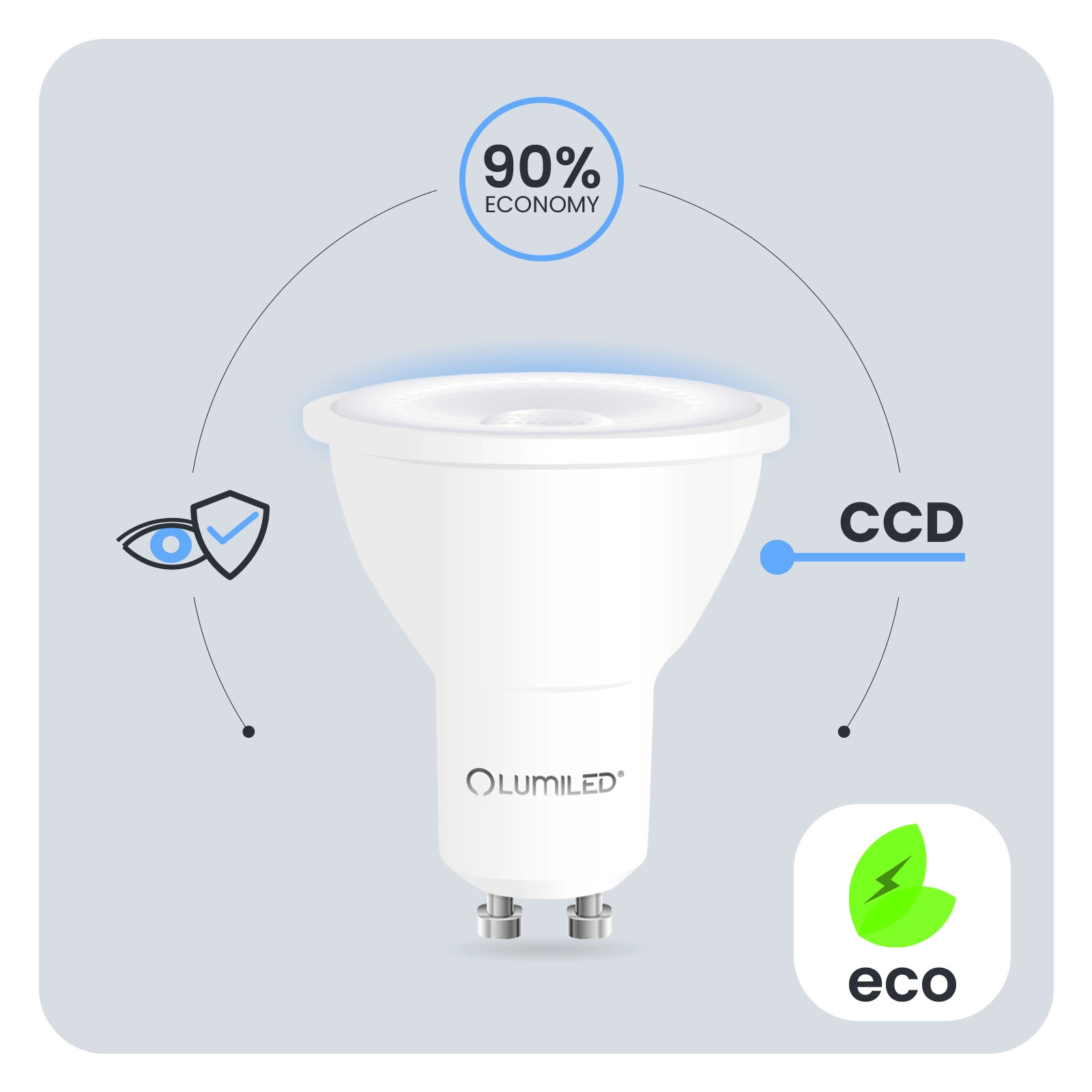 Díky měniči CCD použitému v žárovce LED je žárovka odolná vůči poklesům a špičkám síťového napětí. Světlo nebliká ani se netřese. Díky měniči CCD je žárovka dlouhodobě bezporuchová. Žárovky LUMILED jsou navrženy s ohledem na uživatele. Špatná kvalita osvětlení může vést k únavě očí, proto mají naše žárovky technický vývoj Eye Safe, který zajišťuje pohodlné a šetrné osvětlení pro vaše oči v jakékoli místnosti.