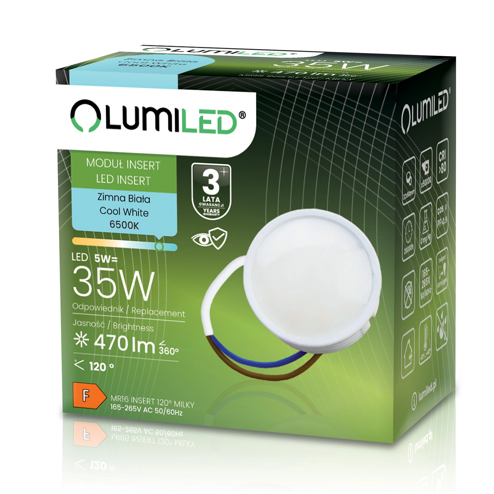 LED modul INSERT značky Lumiled s výkonem 5W je efektivním a energeticky úsporným zdrojem světla, ideálním pro moderní interiéry. Vydává studené bílé světlo s teplotou 6500K. Díky 470 lm svítivosti a širokému úhlu vyzařování 120° efektivně osvětluje velké plochy a zajišťuje přirozené podání barev díky CRI >80. CCD měnič eliminuje blikání a poskytuje stabilní a bezpečné osvětlení pro oči. Ideální pro tradiční halogenové svítidla a komerční aplikace.