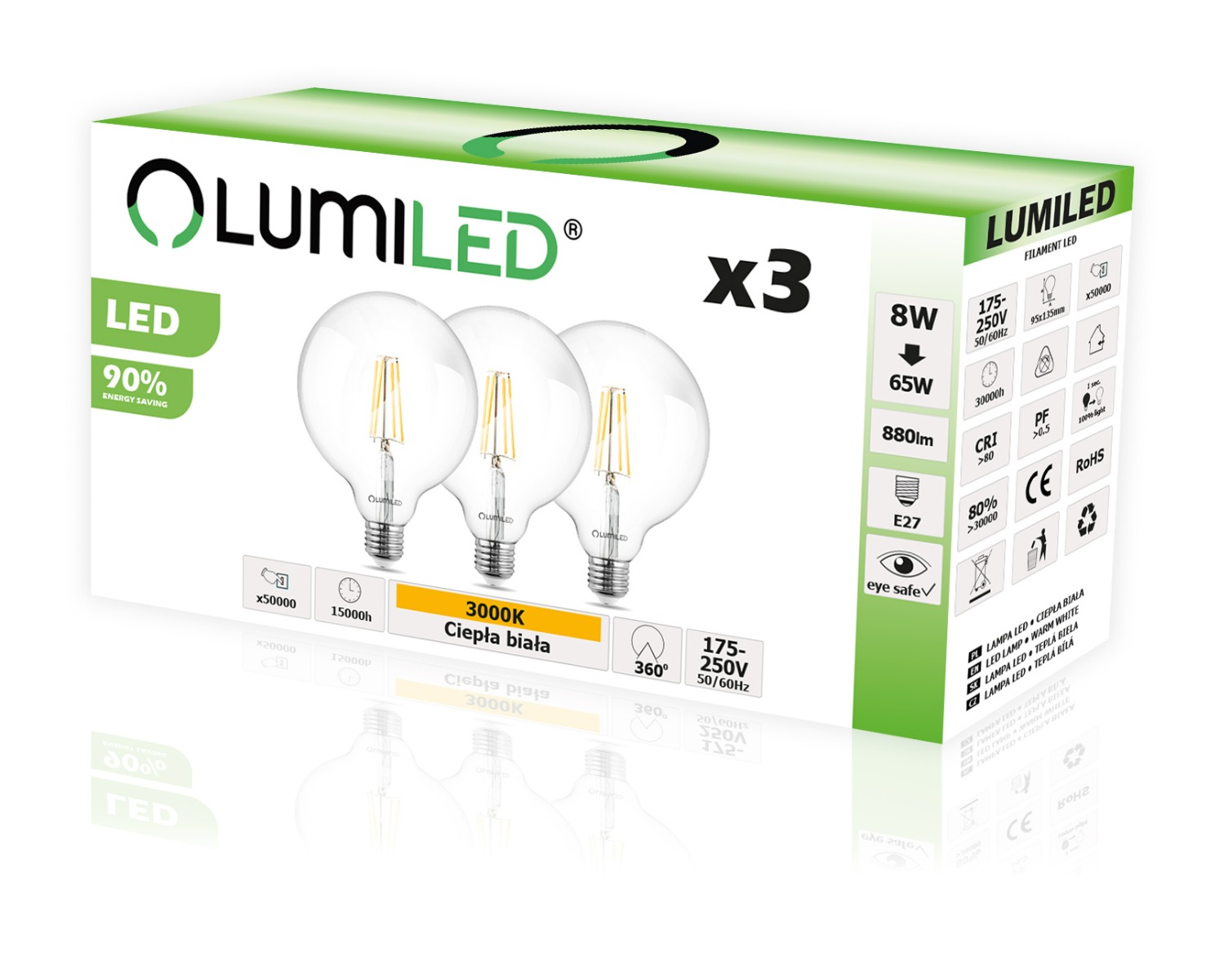 Sada 3x LED žárovky od renomované a v osvětlování uznávané společnosti LUMILED s paticí E27, výkonem 8W a teplou barvou světla . Žárovka je ideální pro každou domácnost, obchod, hotel nebo restauraci jako akcentační nebo dekorativní osvětlení a lze ji instalovat do všech tradičních svítidel vybavených paticí E27 .