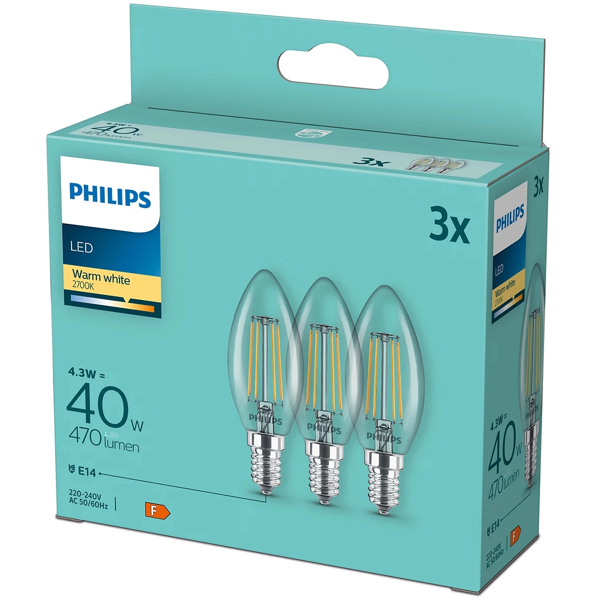 Sada tří žárovek LED značky Philips, které poskytují moderní osvětlení s klasickým vzhledem. Díky použití technologie LED spotřebuje každá žárovka pouhých 4,3 W energie, přesto však nabízí jas odpovídající tradiční 40W žárovce. Žárovky září teplýmbílým světlem s barevnou teplotou 2700 K, které dodá útulnou atmosféru každé místnosti. Neobsahují rtuť, takže jsou šetrné k životnímu prostředí. Ideální pro domácí svítidla s paticí E14, kde je důležitý design i výkon.
