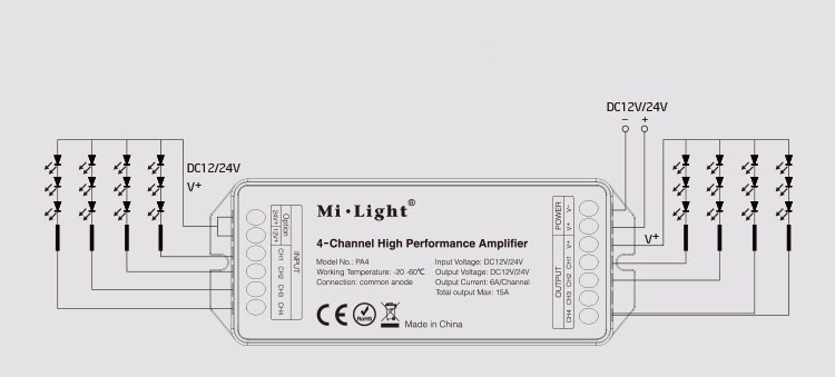 12/24V 15A RGB LED zesilovač se používá v případech, kdy aktuální zatížení RGB produktů (např. LED pásků) překračuje maximální povolený výkon pro ovladač. Použití zesilovače má své opodstatnění i při použití RGB produktů ve velmi dlouhých instalacích, díky čemuž zajišťuje synchronní chod všech modulů současně. Zesilovač může být navržen pro různé typy instalací, protože má čtyři výstupy připravené k použití. Malé a estetické pouzdro umožňuje montáž zesilovače do malých výklenků nebo na nábytek. Přizpůsobeno pro práci s produkty Mi-Light .