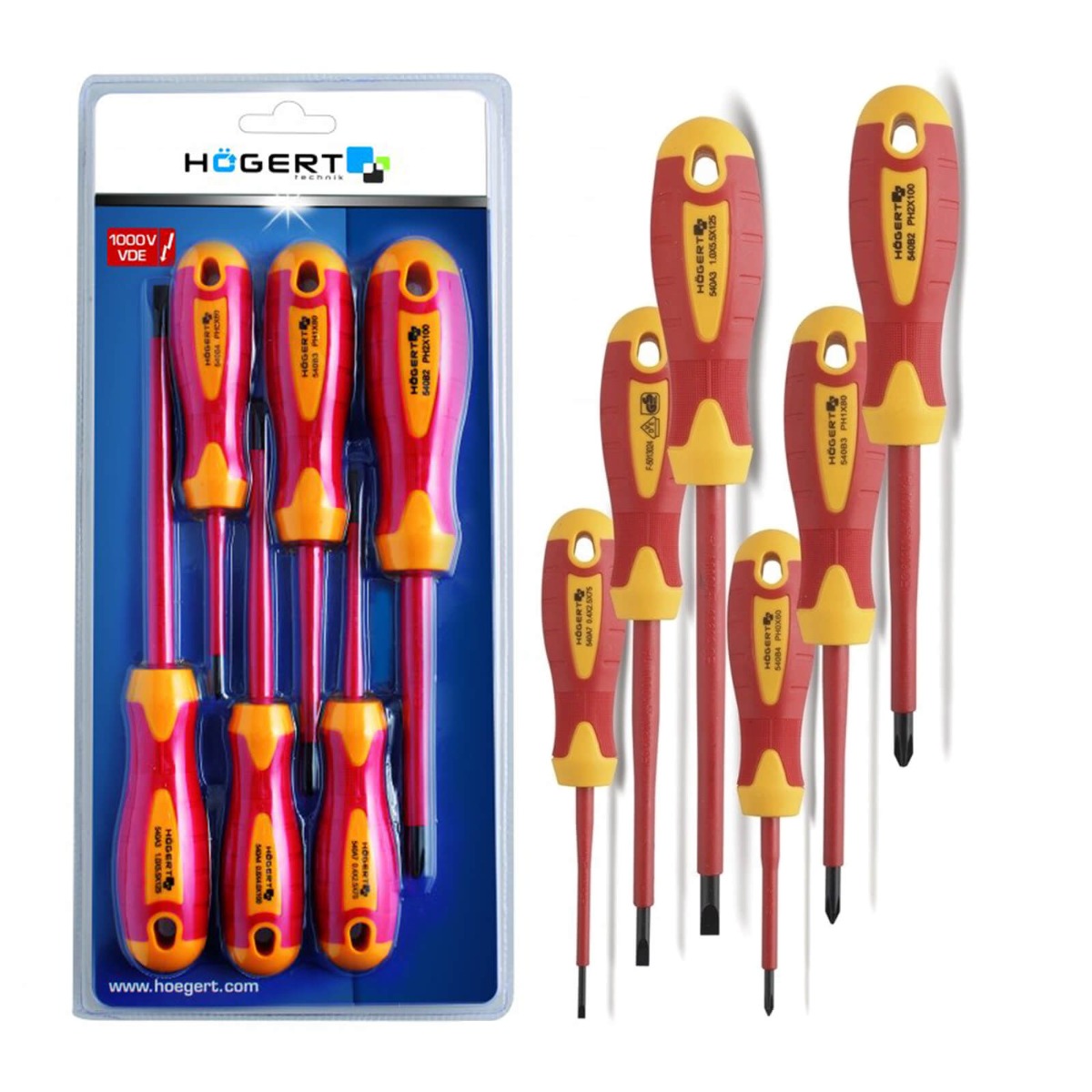 Sada 6 kusů plochých a křížových šroubováků 1000 V certifikováno pro provoz pod napětím. Šroubováky Hoegert Technik se vyznačují špičkovým zpracováním a bezpečností při používání. Vyrobeno z vysoce kvalitního s2 legované oceli poskytuje trvanlivost, odolnost proti deformaci nebo poškození a chrání nástroj před poškozením korozi. Aby byla zajištěna přesnost při používání, je čepel šroubováku izolovaná a magnetická. Rukojeť sestávající z dvousložkové s profilovaným protiskluzový povrch zvyšuje utahovací sílu a bezpečnost práce.