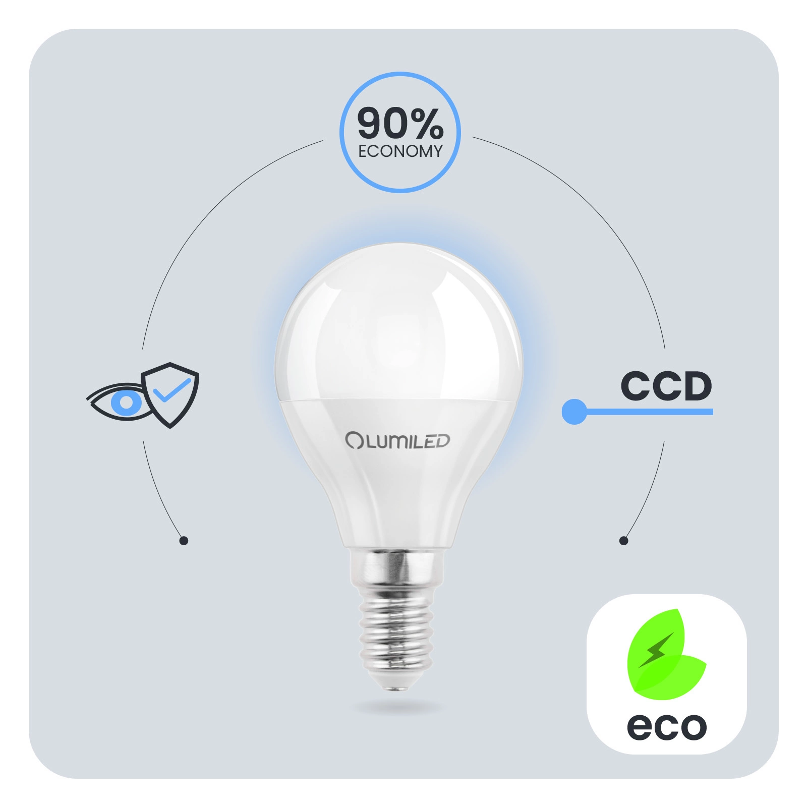 Díky měniči CCD použitému v žárovce LED je žárovka odolná vůči poklesům a špičkám síťového napětí. Světlo nebliká ani se netřese. Díky měniči CCD je žárovka dlouhodobě bezporuchová. Žárovky LUMILED jsou navrženy s ohledem na uživatele. Špatná kvalita osvětlení může vést k únavě očí, proto mají naše žárovky technický vývoj Eye Safe, který zajišťuje pohodlné a šetrné osvětlení pro vaše oči v jakékoli místnosti.