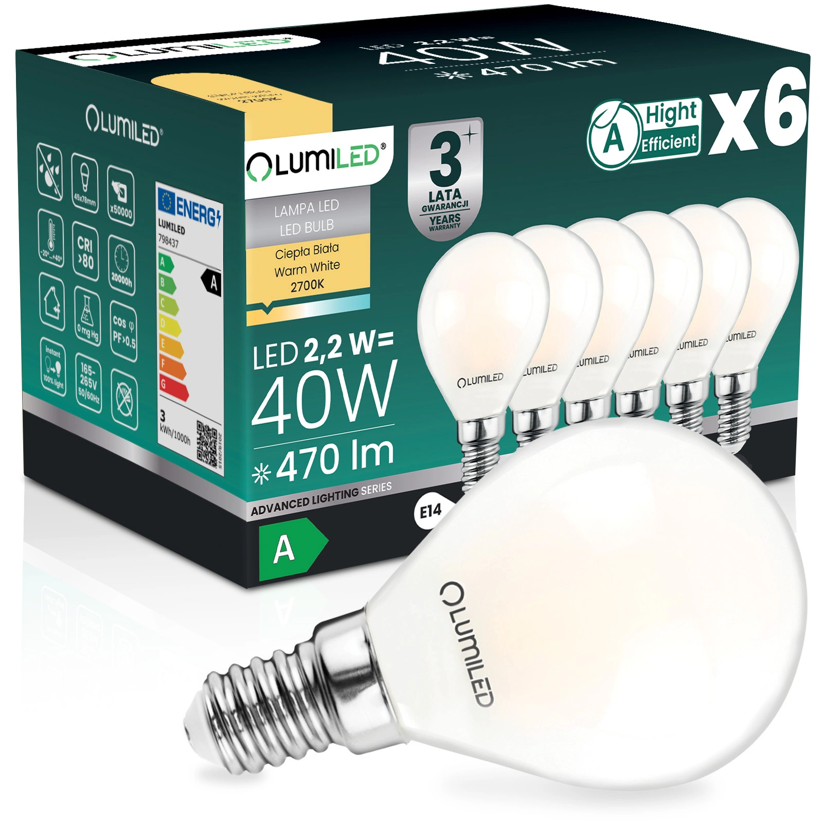 Sada 6x P45 E14 Lumiled LED žárovek v energetické třídě A představuje nejvyšší účinnost - absolutní špičku mezi dekorativními zdroji. Nabízí plný jas 470 lm jako klasická 40W žárovka, ale díky technologii třídy A spotřebuje jen zlomek energie, takže poskytuje stejně jasné a přitom mimořádně úsporné světlo. Právě třída A je zde tím největším rozdílem: maximální účinnost, minimální spotřeba energie a znatelně nižší měsíční účty. Teplá barva 2700K a plný 360° úhel vyzařování dodají vašim interiérům útulnou a harmonickou atmosféru a vy získáte prvotřídní světlo, které funguje s působivou úsporností.