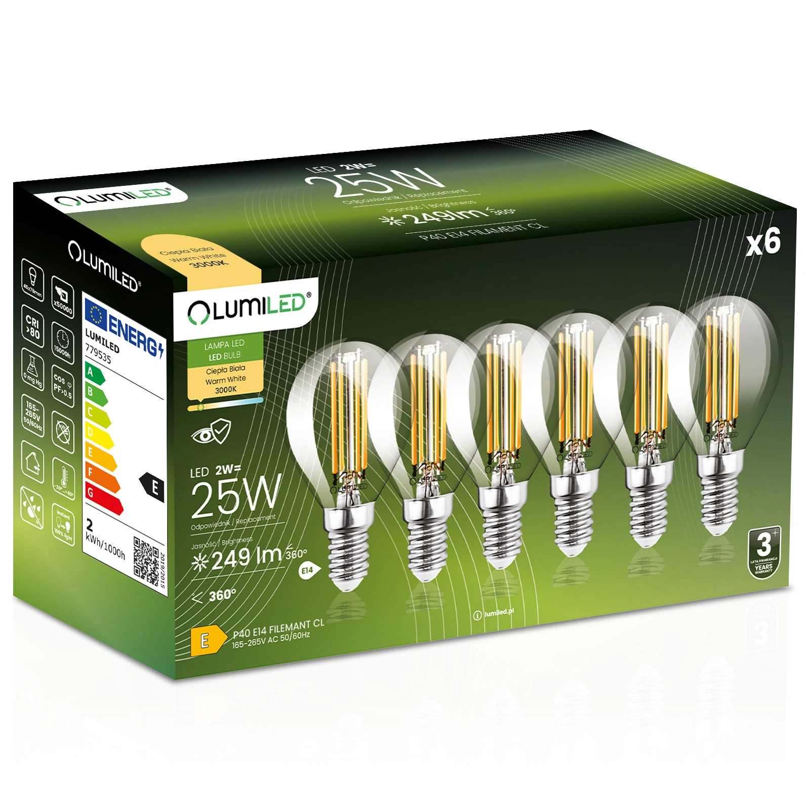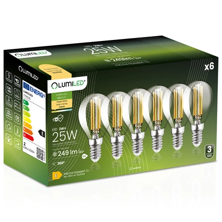 Sada 6x LED žárovek LUMILED se závitem E14 a výkonem 2 W představuje energeticky účinnou náhradu za 25W. Vyzařuje 249 lumenů teplého 3000K světla a vytváří příjemnou atmosféru. Úhel 360° zajišťuje rovnoměrné rozptýlení světla v místnosti. Životnost až 15 000 hodin a provozní rozsah 165-265 V zaručují spolehlivost a dlouhé používání. Ideální volba pro ty, kteří si cení úspory energie a ekologie.