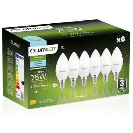 Tatosada 6 žárovek LED od společnosti Lumiled s výkonem 10 W a barvou 6500 K je kombinací vysokého výkonu a energetické účinnosti. S vyzařovaným světelným to kem až 1 100 lumenů poskytuje světlo srovnatelné s tradiční 75wattovou žárovkou a zároveň výrazně snižuje spotřebu elektrické energie. Díky malým rozměrům a závitu E14 je ideální pro nástěnné svícny, lampy a svítidla s omezeným prostorem. Je praktickou volbou pro místnosti, kde potřebujete ostré, ale oku lahodící osvětlení.