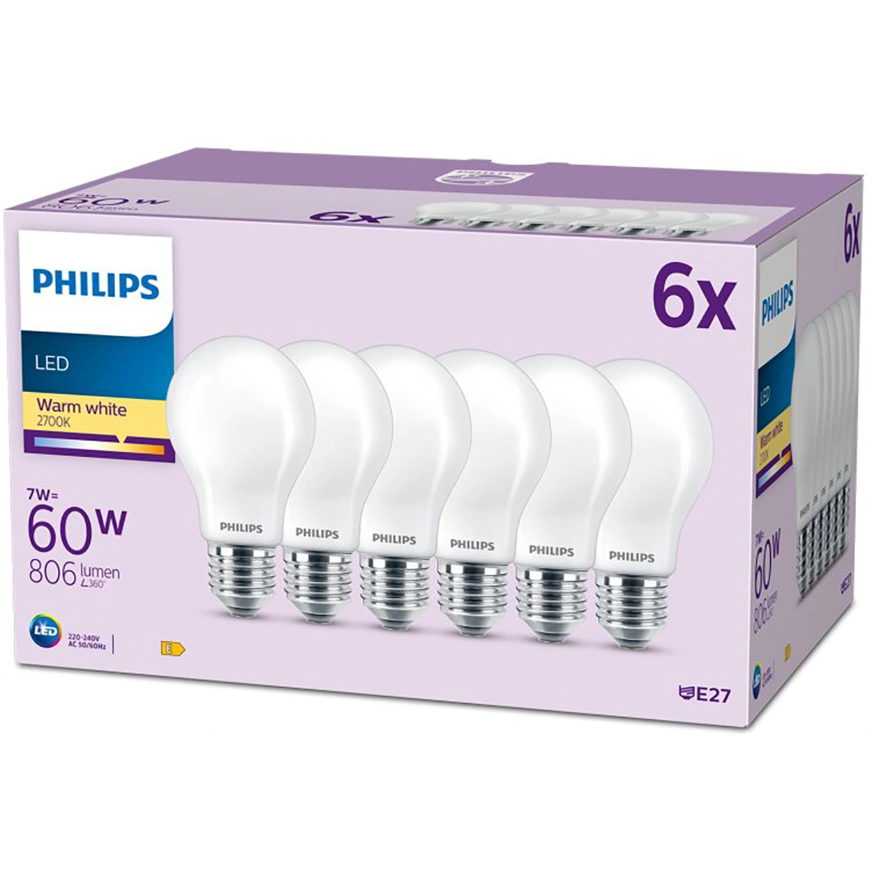 Sada 6x LED žárovky PHILIPS 7W , pro každodenní použití v interiéru. Známé tvary, které máte rádi. Spotřebují přibližně o 85 % méně energie než tradiční žárovky díky nejnovější energeticky úsporné LED technologii a mají desetkrát delší životnost. Standardní žárovka z opálového skla, se závitem E27, 15 000 hodin provozu a světelný tok 806 lumenů. Výkon lampy odpovídá svitu 60W žárovky.