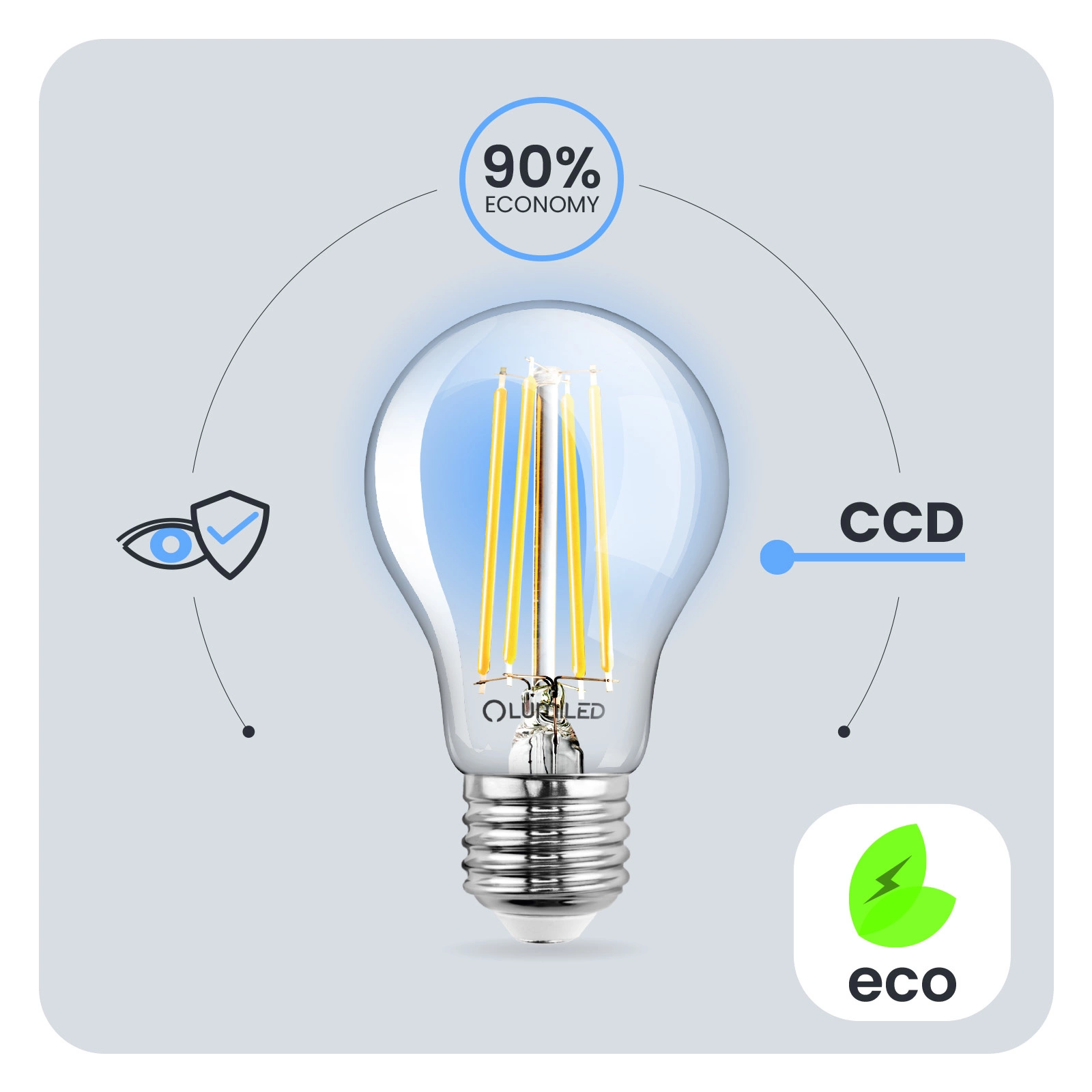Díky měniči CCD použitému v žárovce LED je žárovka odolná vůči poklesům a špičkám síťového napětí. Světlo nebliká ani se netřese. Díky měniči CCD je žárovka dlouhodobě bezporuchová. Žárovky LUMILED jsou navrženy s ohledem na uživatele. Špatná kvalita osvětlení může vést k únavě očí, proto mají naše žárovky technický vývoj Eye Safe, který zajišťuje pohodlné a šetrné osvětlení pro vaše oči v jakékoli místnosti.