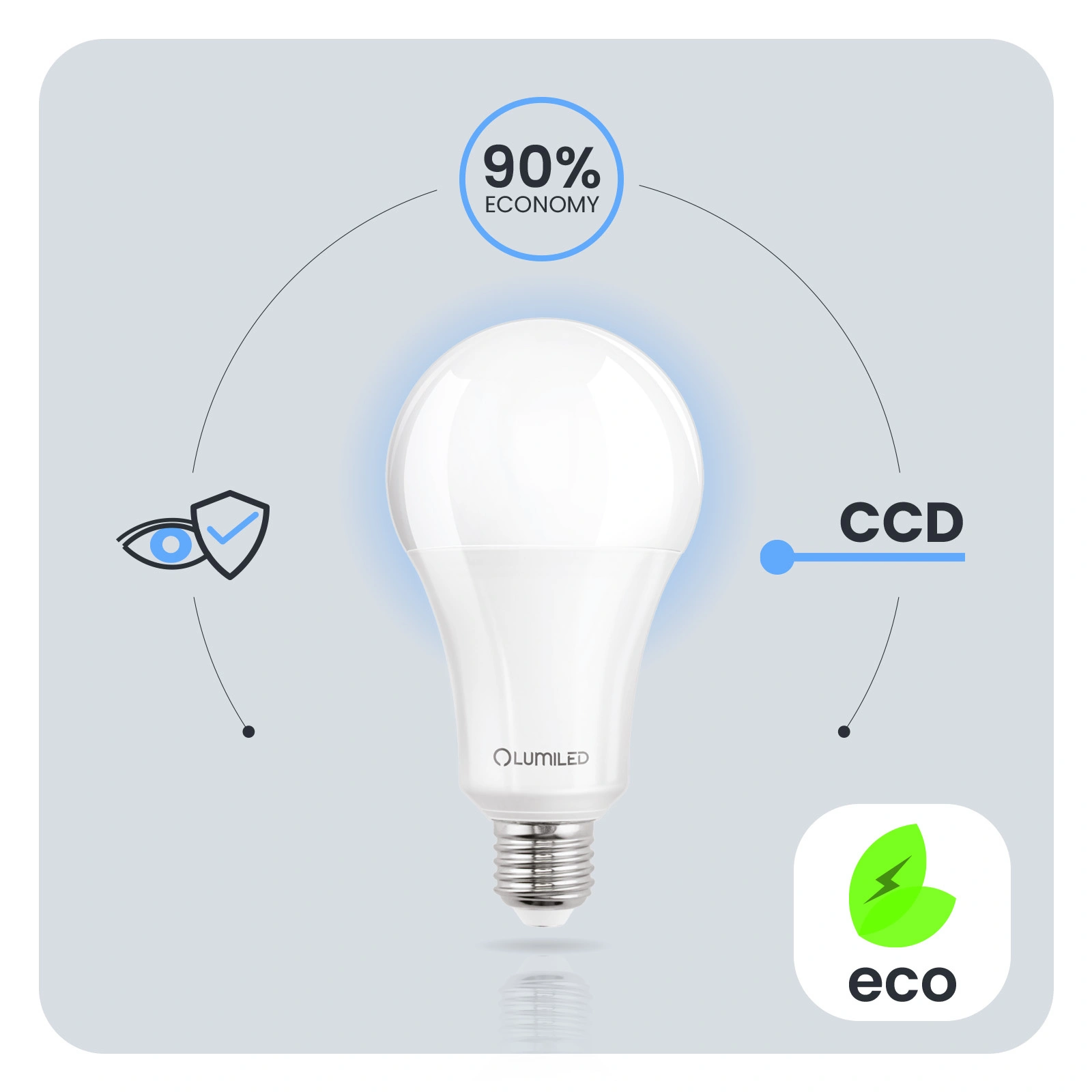 Díky měniči CCD použitému v žárovce LED je žárovka odolná vůči poklesům a špičkám síťového napětí. Světlo nebliká ani se netřese. Díky měniči CCD je žárovka dlouhodobě bezporuchová. Žárovky LUMILED jsou navrženy s ohledem na uživatele. Špatná kvalita osvětlení může vést k únavě očí, proto mají naše žárovky technický vývoj Eye Safe, který zajišťuje pohodlné a šetrné osvětlení pro vaše oči v jakékoli místnosti.