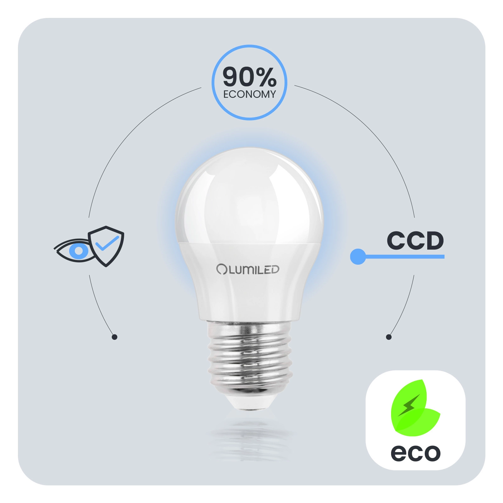 Díky měniči CCD použitému v žárovce LED je žárovka odolná vůči poklesům a špičkám síťového napětí. Světlo nebliká ani se netřese. Díky měniči CCD je žárovka dlouhodobě bezporuchová. Žárovky LUMILED jsou navrženy s ohledem na uživatele. Špatná kvalita osvětlení může vést k únavě očí, proto mají naše žárovky technický vývoj Eye Safe, který zajišťuje pohodlné a šetrné osvětlení pro vaše oči v jakékoli místnosti.