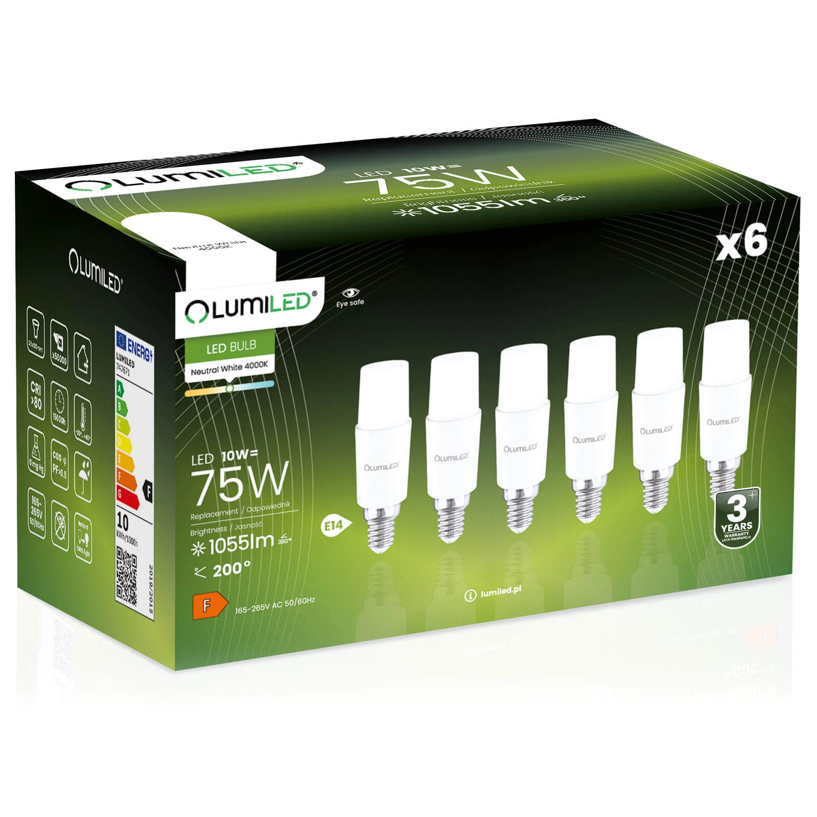 Sada 6 ks LED Stick od renomované a v osvětlování uznávané značky Lumiled s výkonem 10W (odpovídá klasické 75W žárovce) je kvalitní LED světelný zdroj se světelným tokem 1055lm a neutrálním světlem. barva 4000K. Série žárovek STICK se vyznačuje malým stínidlem, které vydává příjemné světlo a zároveň se díky své velikosti (113x36mm) vejde prakticky do každého svítidla se závitem E14.