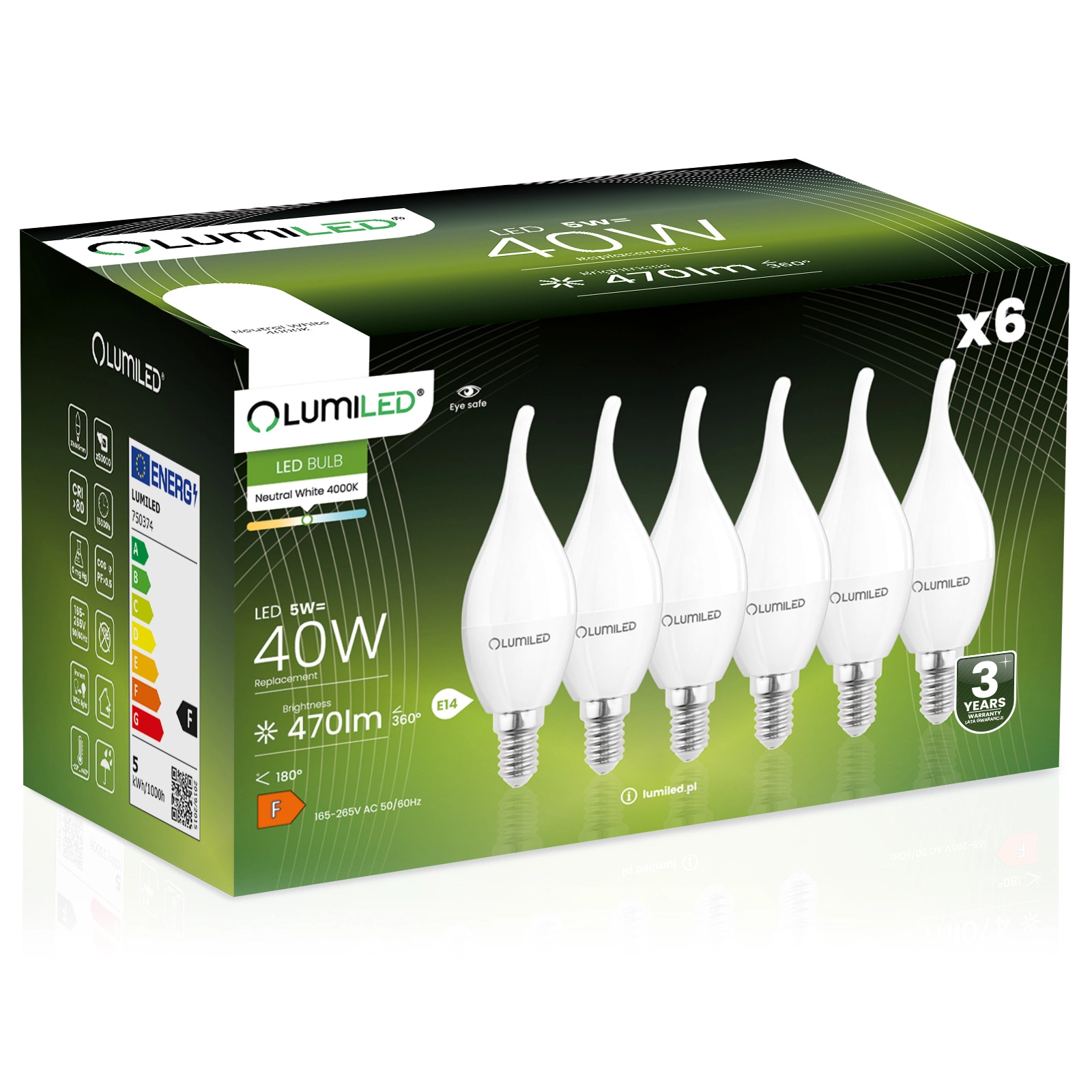 6x Žárovka LED E14, BA35 5W = 40W 470lm 4000K Neutrální bílá 180° LUMILED