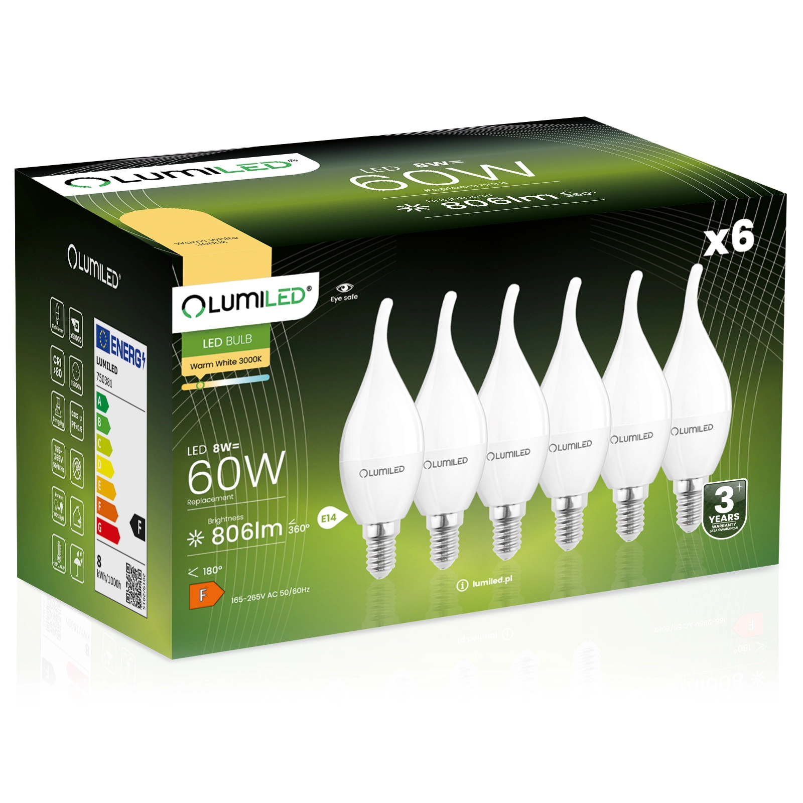 6x Žárovka LED E14, BA35 8W = 60W 806lm 3000K Teplá bílá 180° LUMILED