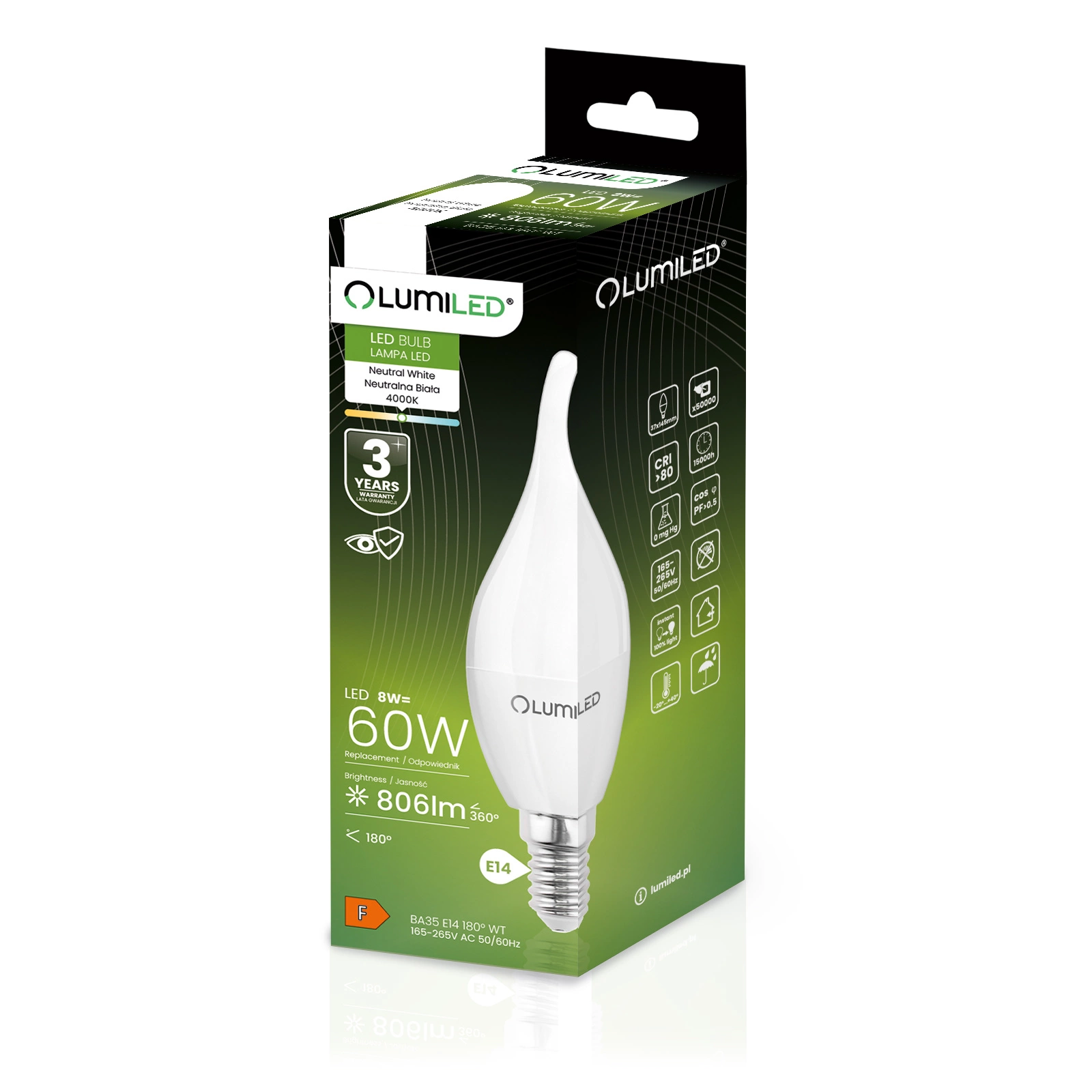 Úsporná LED žárovka BA35 8W je osvědčenou a nejlepší volbou pro univerzální aplikace. Je vhodný pro instalaci do všech standardních modelů stropních svítidel se šroubovací paticí E14.