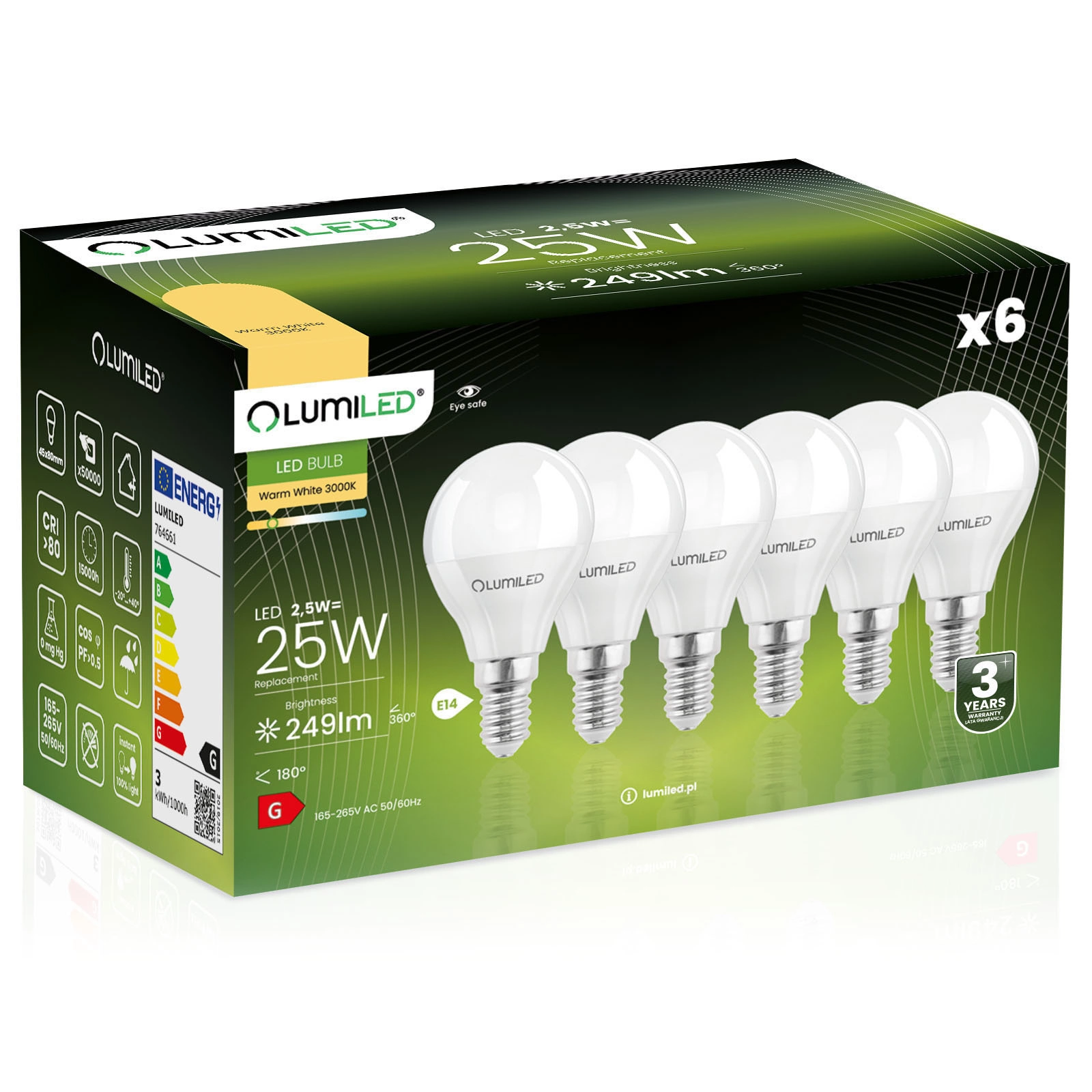 6x Žárovka LED E14, P40 2.5W = 25W 249lm 3000K Teplá bílá 180° LUMILED