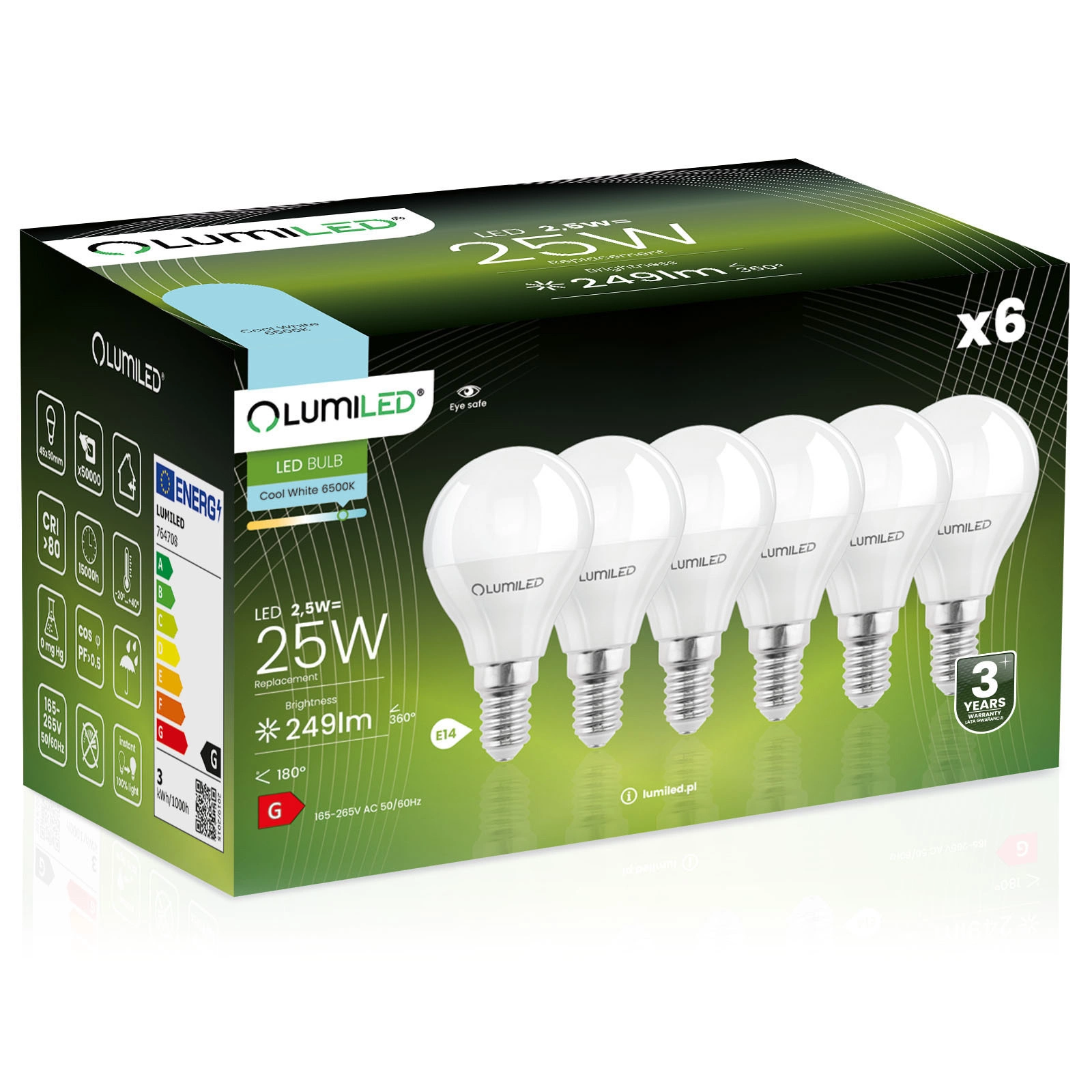 6x Žárovka LED E14, P40 2.5W = 25W 249lm 6500K Studená bílá 180° LUMILED