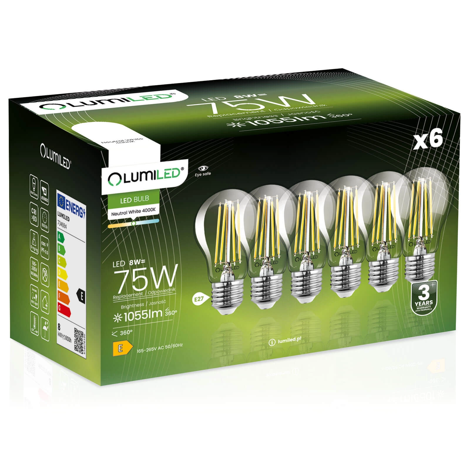 6x Žárovka LED E27, A60 8W = 75W 1055lm 4000K Neutrální bílá 360° Filament LUMILED
