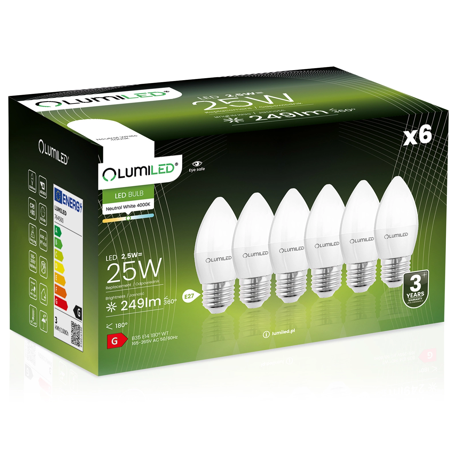 6x Žárovka LED E27, B35 2.5W = 25W 249lm 4000K Neutrální bílá 180° LUMILED