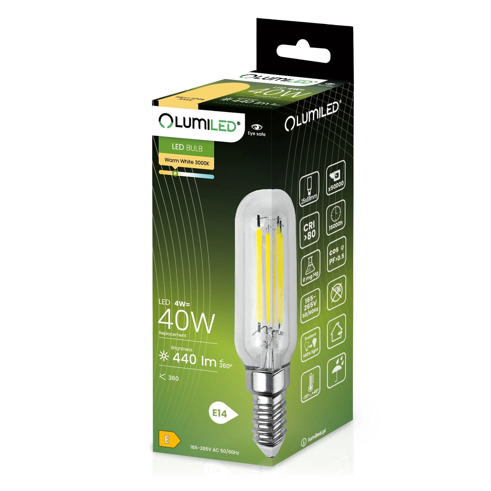 LED žárovka od renomované a v osvětlovacím průmyslu uznávané značky LUMILED ve tvaru malé trubice s paticí E14 a výkonem 4W . Žárovka je ideální pro každou domácnost, obchod, hotel nebo restauraci jako akcentační nebo dekorativní osvětlení a lze ji instalovat do všech tradičních svítidel vybavených paticí E14.
