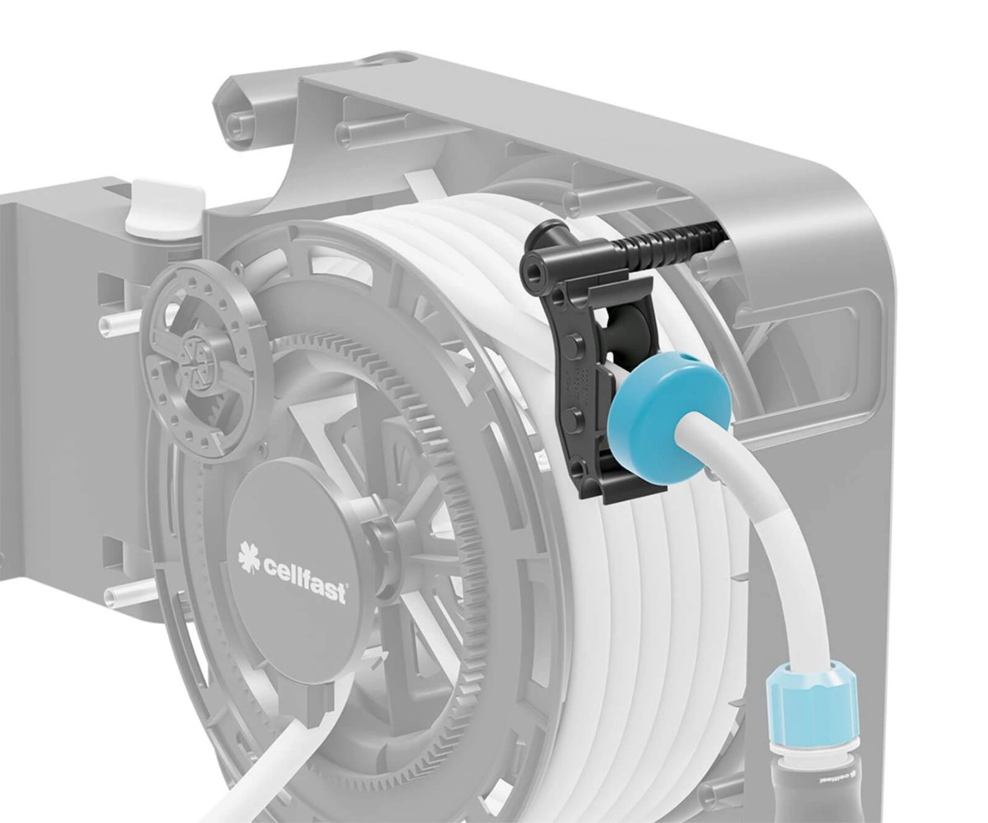 Jednotka byla navržena s ohledem na bezpečnost při zatahování odstředivou brzdou zajišťuje bezpečnou rychlost navíjení hadice, což je důležité zejména v případě, že se na zahradě nacházejí další osoby. Brzda také chrání fasádu budovy a minimalizuje riziko jejího poškození. Abyste zajistili správné navíjení hadice bez ohýbání, kroucení nebo uzlů, které by blokovaly průtok vody, použité šnekový vodicí mechanismus, což zaručuje bezproblémovou a příjemnou práci. Střed retraktoru je pružinový mechanismus, který umožňuje automatické zatahování a prodlužování délky hadice, pokud jde o práce prováděné na zahradě. Tato aplikace umožňuje hladký chod hadice uvnitř spotřebiče. Zařízení je dodáváno s speciálně navrženým nástěnným držákem, který zajišťuje stabilitu retraktoru, z lze otočit o 180° to umožňuje instalaci v úzkých uličkách, ale nejenže šetří místo, ale také zefektivňuje zahradničení. Vestavěný kovové prvky zesílení spojení mezi navíječem a závěsem. Jejich úkolem je bezpečný provoz a zabránění odpojení těchto dvou životně důležitých prvků. Součástí příslušenství je inovativní designový postřikovač a kování od společnosti ERGO. Postřikovač s plynule nastavitelným postřikem a jasným označením usnadňuje výběr správného typu postřiku, od silného proudu až po jemnou mlhu. To je doplněno SYSTÉM SAFETOUCH™ poskytování bezpečné uchopení a pohodlné používání a chrání před náhodným poškozením v případě pádu na tvrdý povrch. Rychlospojka Stop Ergo umožňuje výměnu nebo přerušení postřikovače bez uzavření přívodu vody.
