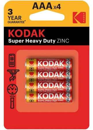 Sada zinko-uhlíkových baterií (blistr po 4 kusech) co do velikosti AAA renomované a ceněné společnosti KODAK. Baterie MN2400 zajišťují, že elektrické spotřebiče vydrží déle než jiné baterie. Společnost KODAK nabízí široký sortiment baterií pro elektronická zařízení, která vyžadují spolehlivý zdroj energie. Baterie R03 značky KODAK jsou multifunkční alkalické baterie, které jsou ideální pro napájení každodenních zařízení, která potřebují dodatečnou dávku energie.