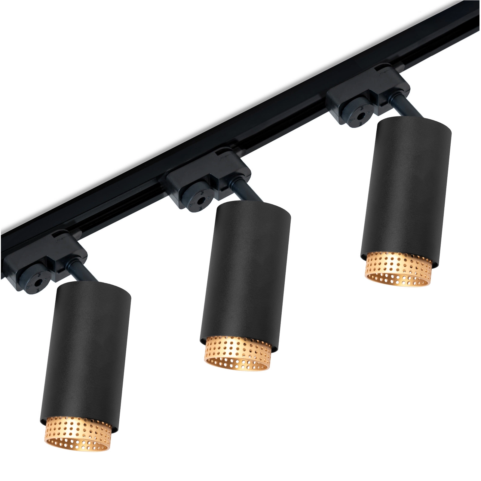 Kompletní sada obsahuje kolejnici, 3 reflektory a montážní držáky a jednoduchá montáž umožňuje rychlé upevnění bez použití specializovaného nářadí. Reflektory s paticemi GU10 pracují s LED diodami do 12 W, což vám dává možnost volby barvy a světelného výkonu při nízké spotřebě energie. Moderní černozlaté provedení a štíhlý válcový tvar v matné černé barvě podtrhují styl industriálních a minimalistických interiérů.