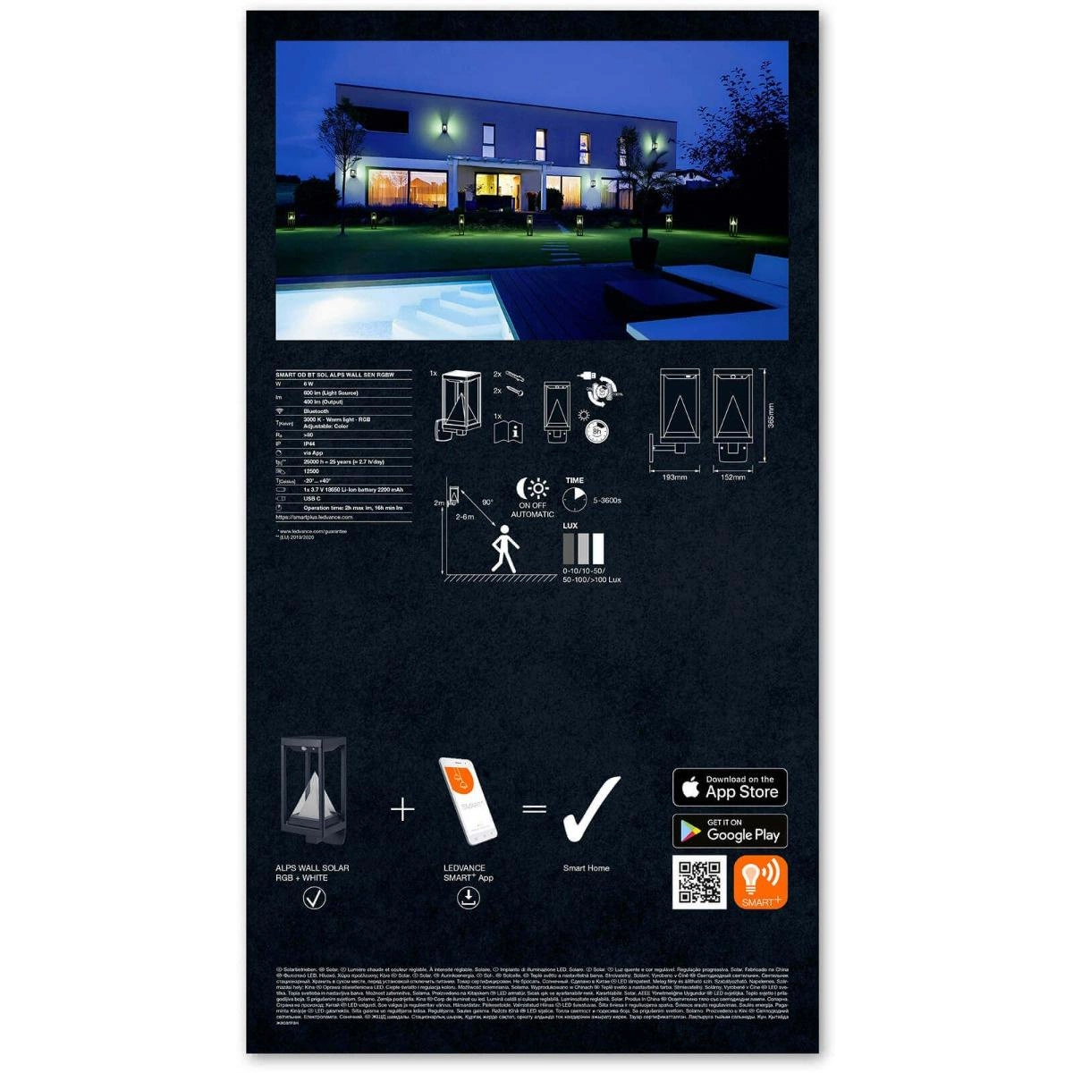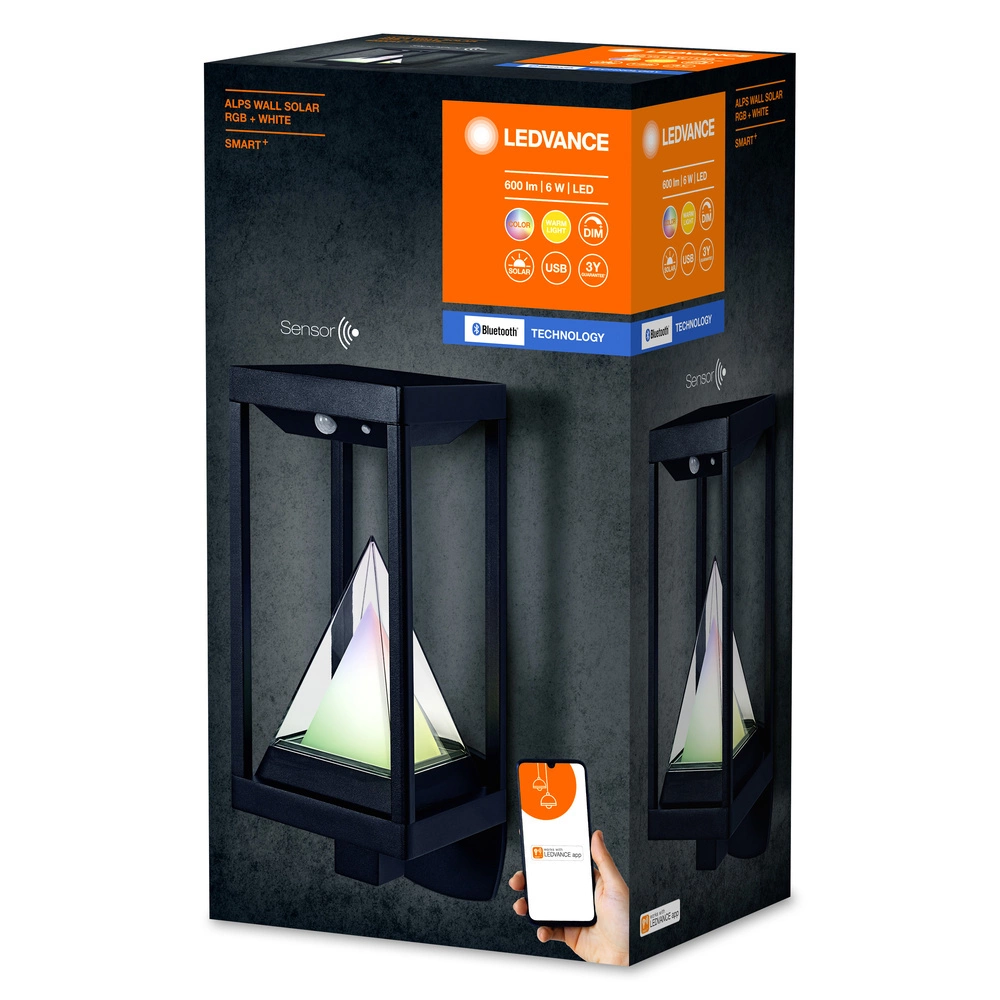 Inteligentní venkovní zahradní nástěnné svítidlo ze série SMART+ od renomované a ceněné společnosti LEDVANCE  v oboru osvětlení . Prezentovaná lampa má širokou škálu možností. Stačí nainstalovat aplikaci ( pro Android: LEDVANCE SMART+ ) z obchodu Google Play nebo pro iOS: spusťte aplikaci Apple Home a je to! Vestavěný pohybový a světelný senzor zajišťuje úsporu energie a vysoký stupeň krytí IP44 umožňuje externí instalaci a zároveň se těší dlouhé životnosti díky solárnímu napájení. Pomocí kompatibilní aplikace můžeme měnit barvu světla (na výběr téměř 16 milionů barev) a upravovat jas díky možnosti stmívání. Aplikace vám umožňuje ovládat osvětlení, i když jste mimo domov, a když se vrátíte, automaticky rozsvítí světlo. Nástěnné svítidlo 6W se světelným tokem 400lm skvěle zapadne do našeho okolí.