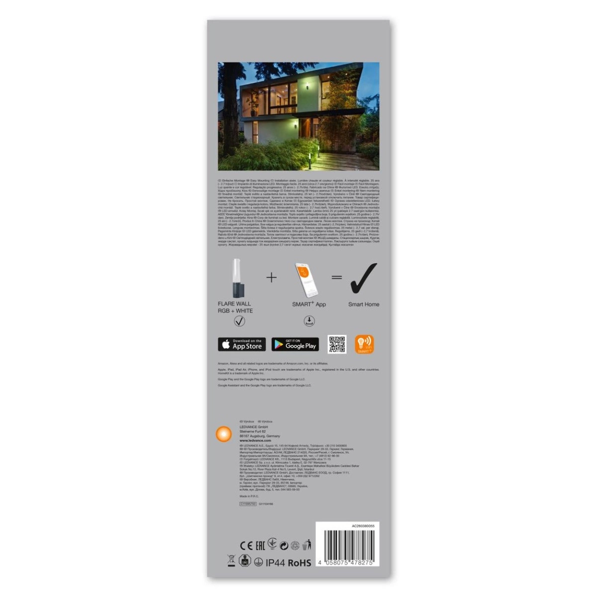 Venkovní fasádní nástěnné svítidlo Flare Ledvance LED je dokonalou kombinací funkčnosti a elegance. Je vybaveno nejmodernější technologií LED s příkonem 7,5 W a světelným tokem 320 lm, takže poskytuje světelnou účinnost 43 lm/W. Vyzařuje příjemné teplé bílé světlo o teplotě 3000 K a vícebarevné osvětlení RGBW, které umožňuje přizpůsobit atmosféru vašim individuálním potřebám.