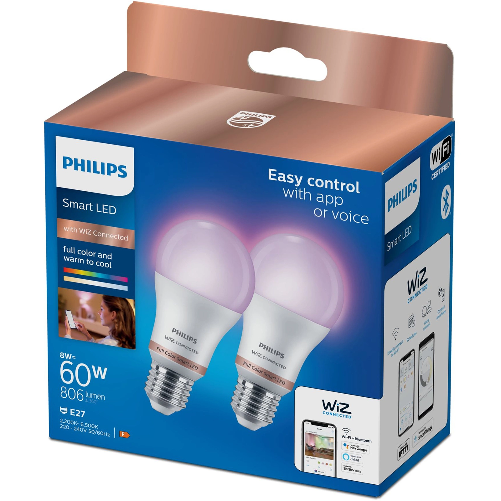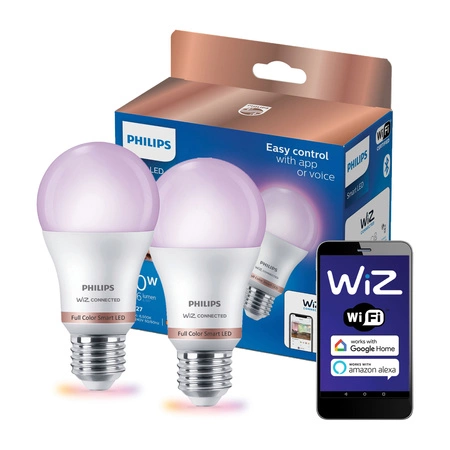 Sada chytrých žárovek LED od Philips ovládání pomocí mobilní aplikace WiZ Connected. LED žárovky se vyznačují velmi dobrou kvalitou vyzařovaného světla, věrnou reprodukcí barev (CRI90) a vysokou světelnou účinností. Chytré LED žárovky Philips mají energeticky úsporný LED zdroj světla o příkonu 8,5 W (odpovídá tradiční 60W žárovce), světelný tok 806 lm a díky mobilní aplikaci i výkon WiZ Connected můžeme nastavit teplotu barvy žárovky od příjemné teplé přes neutrální až po studenou a vícebarevnou (RGB).
