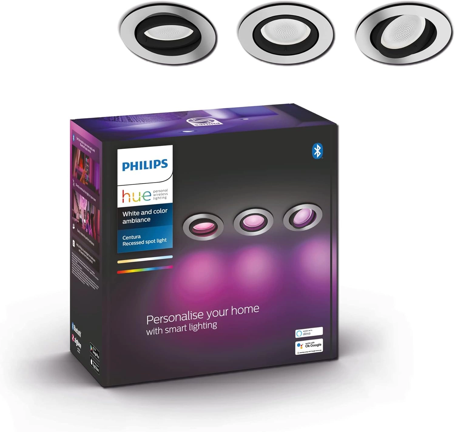 3x LED svítidlo pro zapuštěnou montáž 4,2 W 400 lm IP20 Bílá a Color Ambiance RGB + TW Aluminium Smart SMART Zigbee Bluetooth Centura Philips HUE