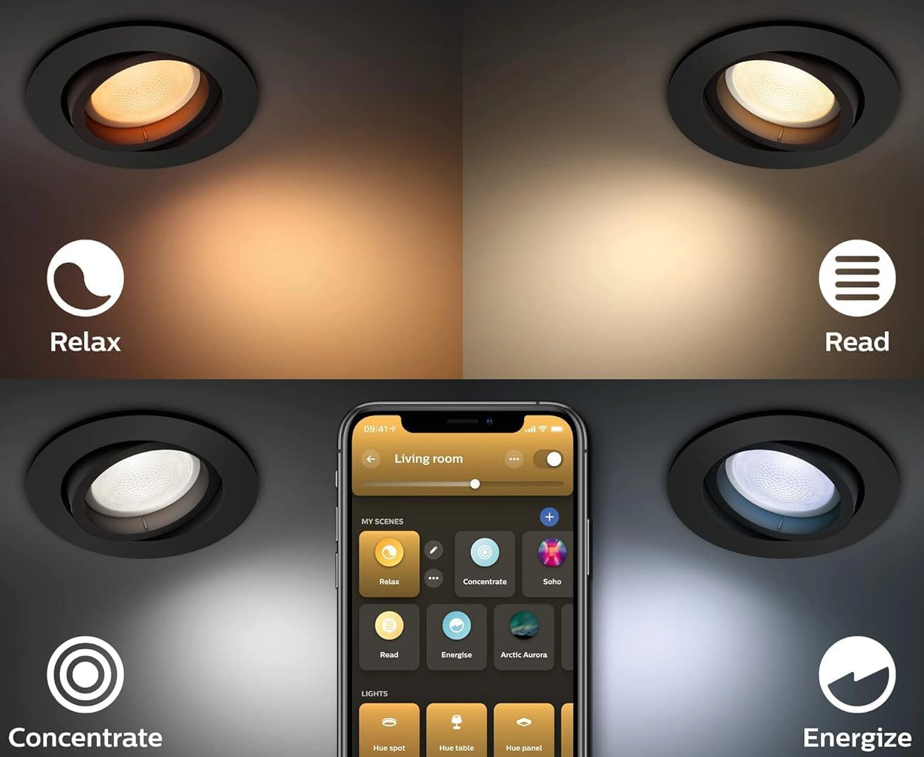 Proměňte svůj domov jediným dotykem. S Philips Hue se každá místnost může stát relaxační zónou, energickým pracovním prostorem nebo atmosférickým místem pro setkání. Vyberte si z milionů barev nebo dokonalý odstín bílé - od teplé záře svíček po chladné denní světlo. Použijte přednastavené scény nebo si vytvořte vlastní, vše ovládané chytrým telefonem během několika sekund.