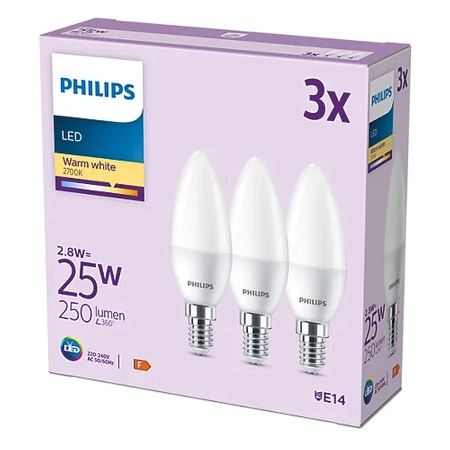 Sada 3x LED žárovka se šroubovací paticí E14 PHILIPS je ideální náhradou tradičních žárovek. V porovnání s tradičními žárovkami spotřebuje LED žárovka PHILIPS až o 90 % méně elektřiny, což přináší velké úspory. Žárovka byla vyrobena s využitím nejmodernějších řešení založených na inovativní technologii LED, která se vyznačují vysokou účinností světelných parametrů, věrnou reprodukcí barev osvětlovaných předmětů a mimořádně dlouhou životností. Pokud se rozhodnete koupit žárovky LED PHILIPS, můžete si být jisti, že získáváte prvotřídní výrobek, který uspokojí každého, i toho nejnáročnějšího zákazníka.