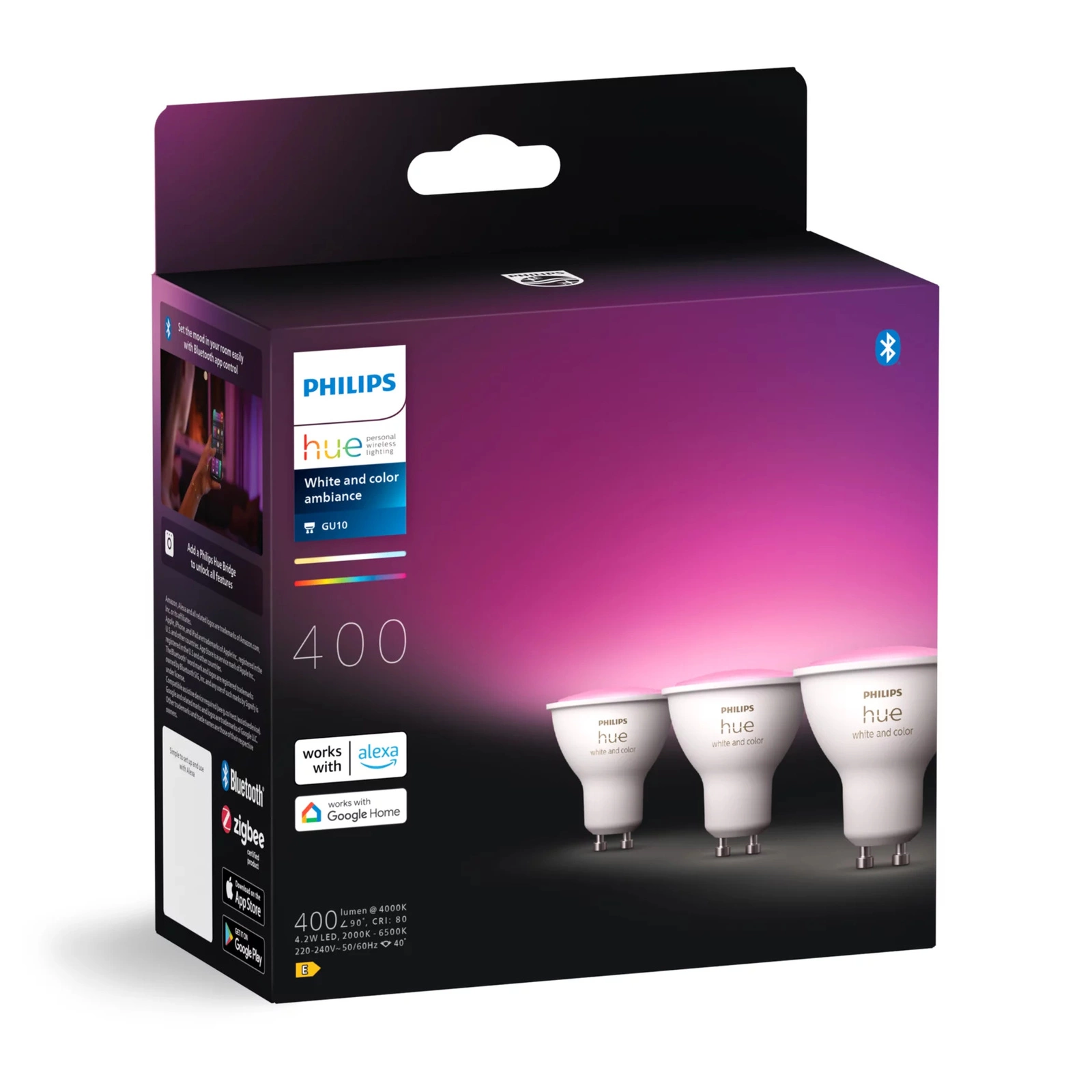 3x LED žárovka GU10 s reflektorem 4,2W = 50W 400lm 2000-6500K CCT + RGB SMART Smart Bluetooth ZigBee Bílá a barevná atmosféra Philips HUE