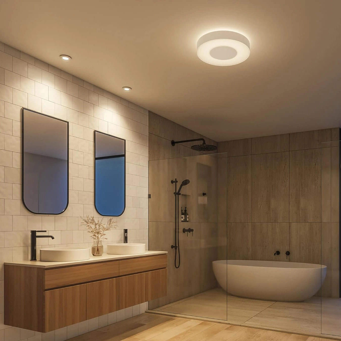 - Koupelny: Díky vzduchotěsné konstrukci a stupni krytí IP44 jsou svítidla ideální pro použití ve vlhkých prostorách, jako jsou koupelny, a poskytují pohodlné a bezpečné osvětlení.