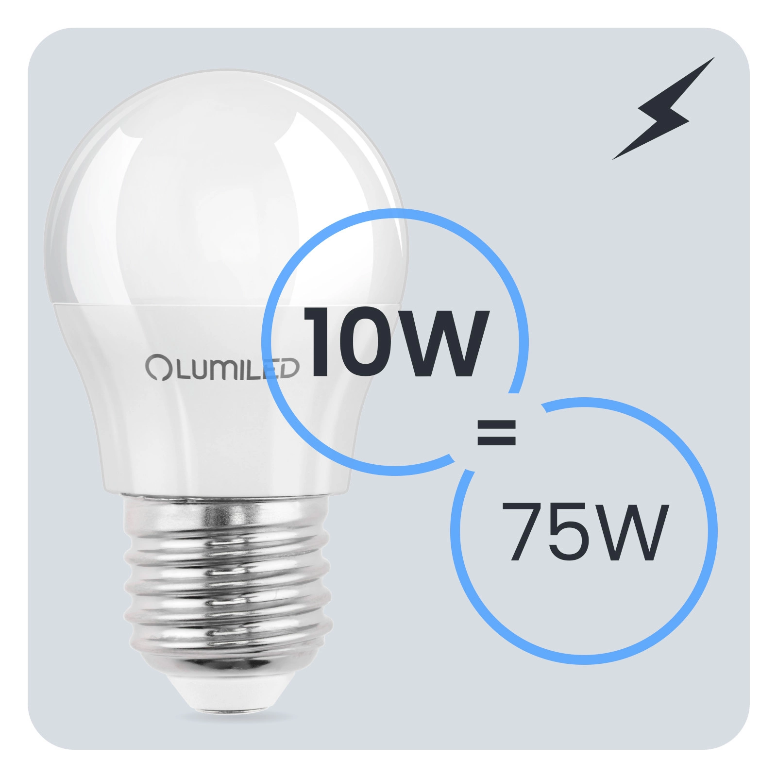 Tato sada 6 žárovek LUMILED LED se závitem E27 a výkonem 10 W je energeticky účinnou náhradou za 75W. Vyzařuje 1100 lumenů studeného 6500K světla, které je ideální pro interiéry. Úhel svícení 180° zajišťuje široký rozptyl. Životnost až 15 000 hodin a provozní rozsah 165-265 V zaručují dlouhodobé používání. Ideální pro ty, kteří si cení úspory energie a ekologie.