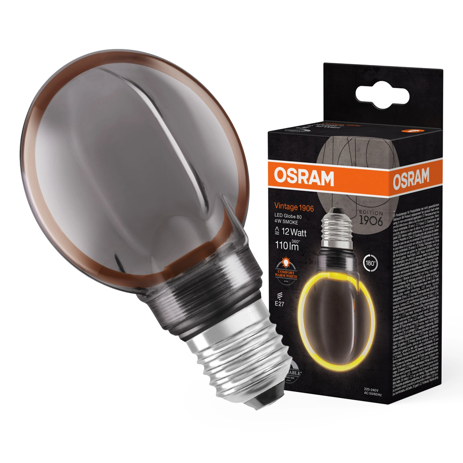 Dekorativní žárovka LED G80 od společnosti Osram z řady Vintage 1906 je dokonalou kombinací modernosti a retro stylu. Díky svému klasickému kulovému tvaru s kouřovým sklem vytvoří v každé místnosti jedinečnou atmosféru. Díky jmenovitému výkonu 4 W, který odpovídá tradiční 50W žárovce, poskytuje žárovka výraznou úsporu energie. Vyzařuje teplé bílé světlo s barevnou teplotou 1800 K a distribučním úhlem 330°, takže je ideální do domácích interiérů pro vytvoření útulné atmosféry.