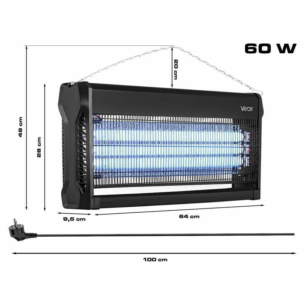 Insekticidní lampa VAYOX je spolehlivý elektrický lapač s dosahem až 300 m², ideální pro ochranu před mouchami, komáry a dalším hmyzem. Má příkon 60 W a síťový provoz, což zajišťuje účinnost a pohodlné používání venku i uvnitř. Robustní konstrukce ze syntetických materiálů a kovu v klasické černé barvě dokonale zapadne do každého prostředí.