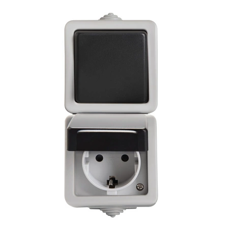 Jednopólový spínač + vertikální zásuvka Schuko s ochranou kontaktů TEKNO IP54 Šedá KANLUX