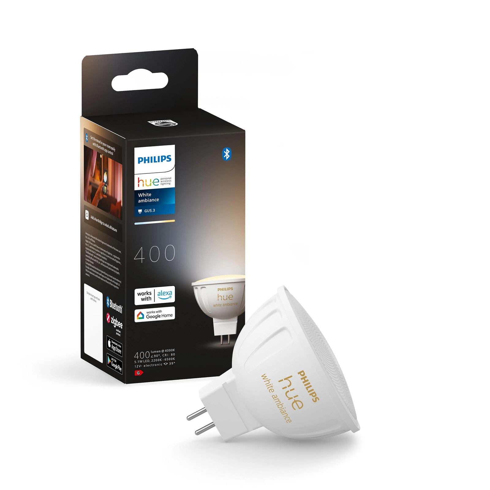Chytrá žárovka HUE LED uznávaný a respektovaný v oboru osvětlení Philips. Je vybaven závitem GU5.3 a 5,1W úsporným světelným zdrojem LED. Reflektor se vyznačuje velmi dobrou kvalitou vyzařovaného světla, věrnou reprodukcí barev (CRI80) a vysokou světelnou účinností. Má velmi účinný světelný tok - 400 lm, vyzařuje příjemné a relaxační světlo z nastavitelný teploty barev od příjemně teplých přes neutrální až po studené.