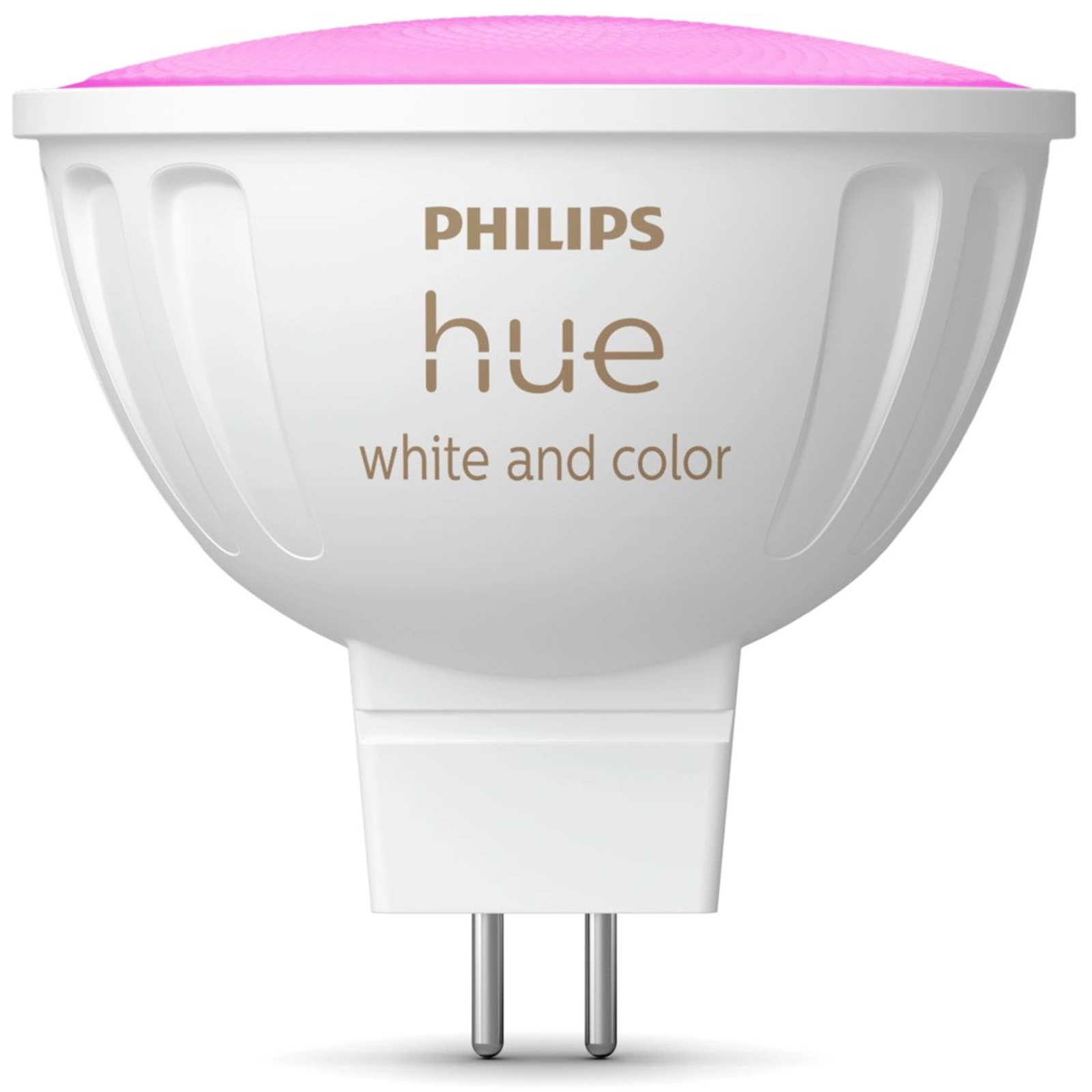 Chytrá žárovka HUE LED uznávaný a respektovaný v oboru osvětlení Philips. Je vybaven závitem GU5.3 a 6,3W úsporným světelným zdrojem LED. Reflektor se vyznačuje velmi dobrou kvalitou vyzařovaného světla, věrnou reprodukcí barev (CRI80) a vysokou světelnou účinností. Má velmi účinný světelný tok - 400 lm, vyzařuje příjemné a relaxační světlo z nastavitelný teploty barev od příjemně teplých přes neutrální až po studené a vícebarevné (RGB).