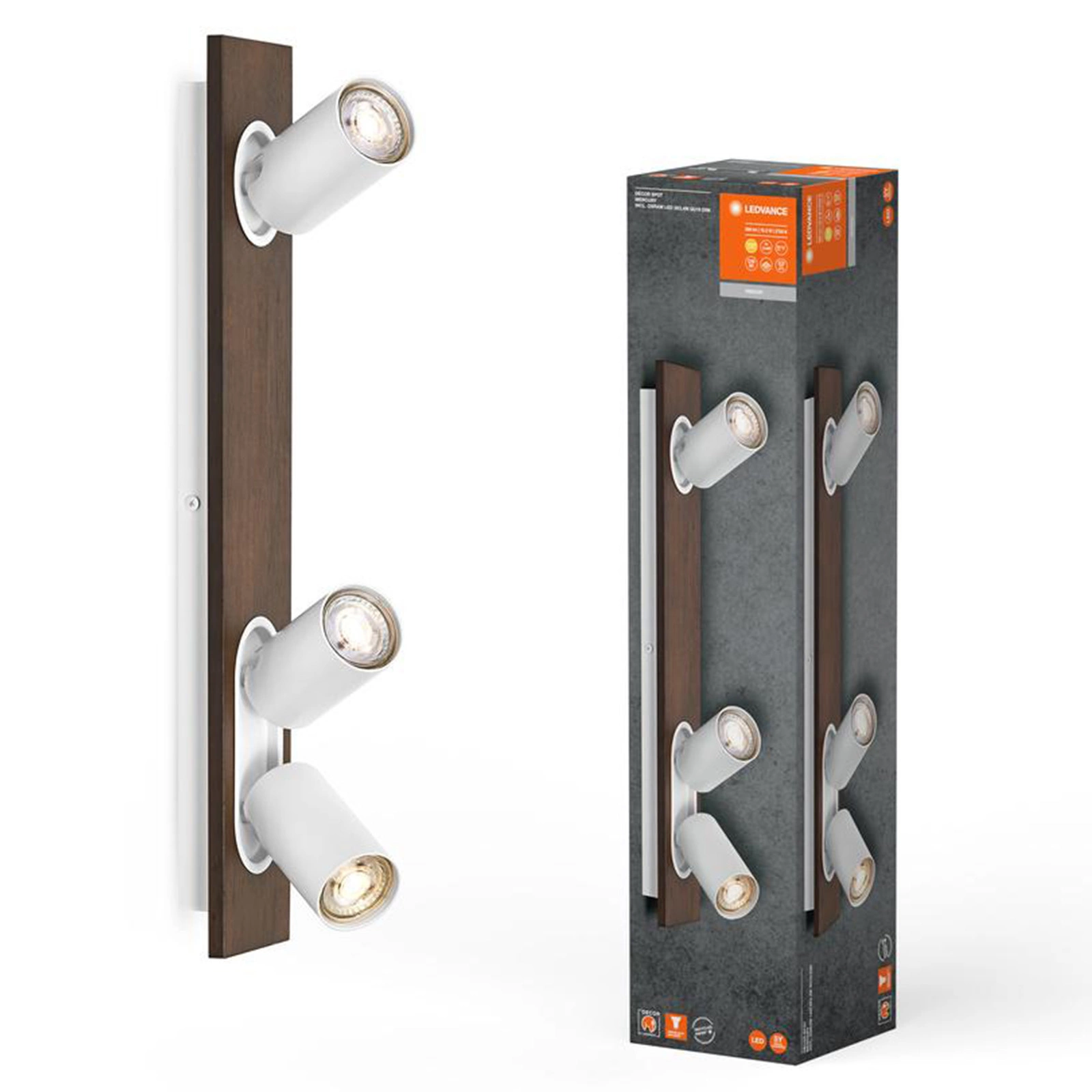 Decor Spot Mercury GU10 od společnosti Ledvance je moderní svítidlo s elegantním designem. matný povrch v černé nebo bílé barvě a dekor dřeva. která dodává interiéru stylový a přirozený vzhled. Toto univerzální stropní svítidlo. z kovu a dřeva. dokonale se hodí k industriálnímu a modernímu designu interiéru. Je vybaven nastavitelnými hlavami s vyměnitelnými světelnými zdroji GU10 a přepínatelnou a stmívatelnou žárovkou OSRAM. která umožňuje nastavit jas a směr světla v místnosti. Díky snadné montáži a vysoce kvalitním materiálům. je ideálním řešením osvětlení pro domácnosti a kanceláře.