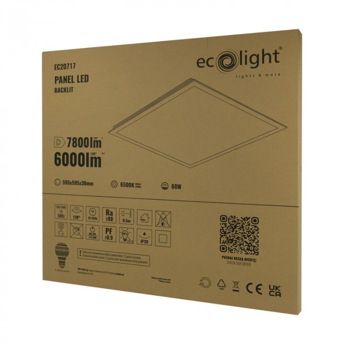 Panel je nejen estetický, ale také vysoce účinný, s příkonem 60 W a účiníkem λ 0,9. Je vyroben z odolného polyvinylchloridu (PVC) a zaručuje životnost 20 000 hodin provozu. Úhel rozložení světla 120° umožňuje rovnoměrné osvětlení velkých prostor. Ať se tento LED panel stane nedílnou součástí každého moderního interiéru!