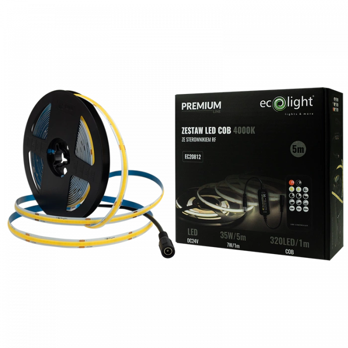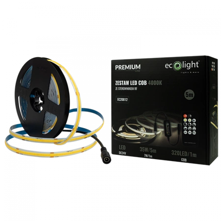 LED pásek COB 7W/m 630lm/m 320LED/m 24V 4000K neutrální IP20 naviják 5m + napájecí zdroj + dálkové ovládání Ecolight