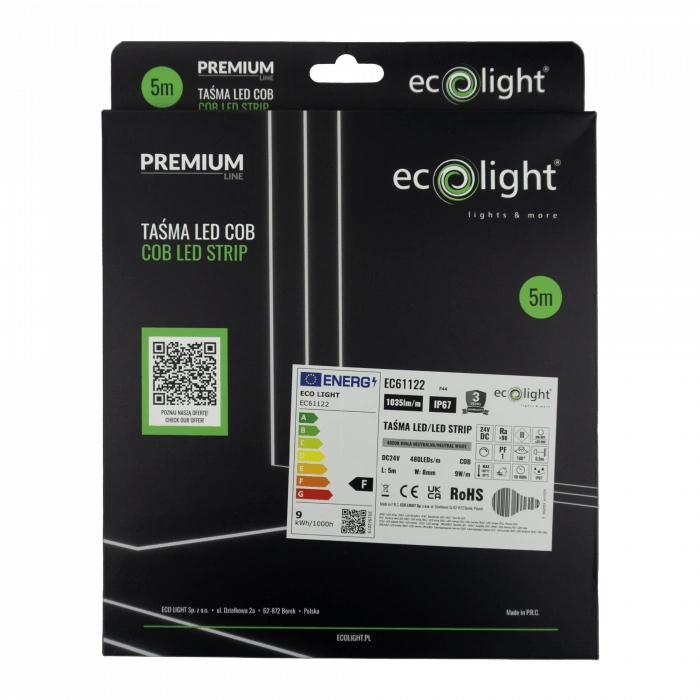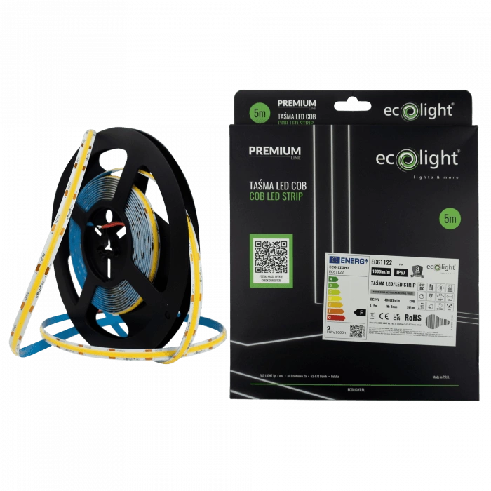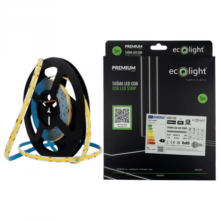 Objevte výkon a spolehlivost, které nabízí náš LED pásek COB 9W/m 1035lm/m 480LED/m 24V 4000K Neutral IP67 v 5m roli od společnosti Ecolight. Tento technologicky vyspělý LED pásek s COB diodami poskytuje rovnoměrné světlo s neutrální barvou 4000 K, které je ideální pro jakýkoli interiér. Výjimečná hustota 480 LED diod na metr zaručuje mimořádně intenzivní osvětlení se světelným tokem 1035 lm/m. Lištu můžete používat v interiéru i exteriéru díky stupni krytí IP67, který ji chrání před vlhkostí a prachem, takže je ideální volbou do koupelen, kuchyní nebo na terasy.