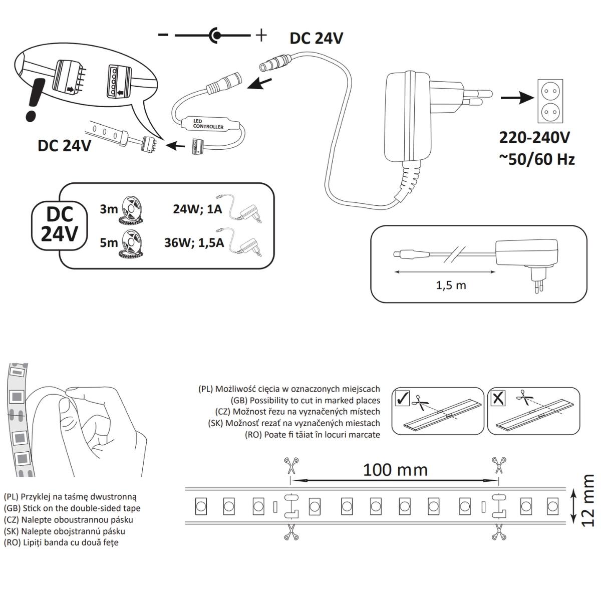 • Snadné použití: Sada obsahuje řídicí jednotku, dálkový RF ovladač a napájecí zdroj, což umožňuje snadné ovládání a rychlou instalaci bez nutnosti použití dalších nástrojů nebo kabeláže.