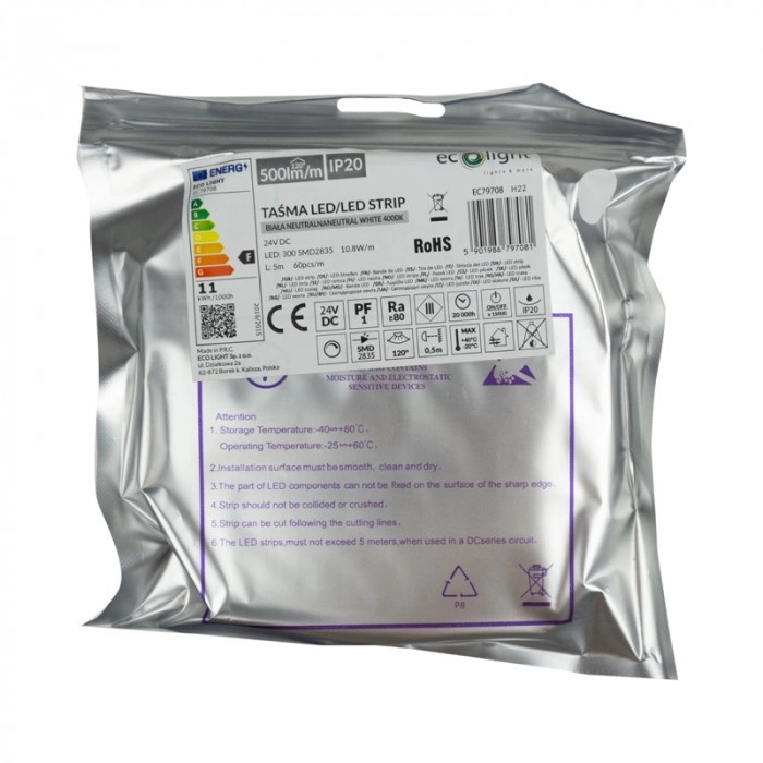 Objevte novou dimenzi osvětlení s LED páskem Ecolight SMD 2835. Náš LED pásek je ideálním řešením pro osvětlení interiérů, poskytuje jas a úsporu energie s 54 W a 10,8 W na metr. Světelný tok 500 lm/m a neutrální barva světla 4000 K vytvoří příjemnou atmosféru v každé místnosti, ať už se jedná o obývací pokoj, ložnici nebo chodbu. Díky integrovaným LED diodám SMD 2835 nabízí naše LED pásky intenzivní a rovnoměrné osvětlení a díky šířce 8 mm se vejdou i do těžko přístupných míst.