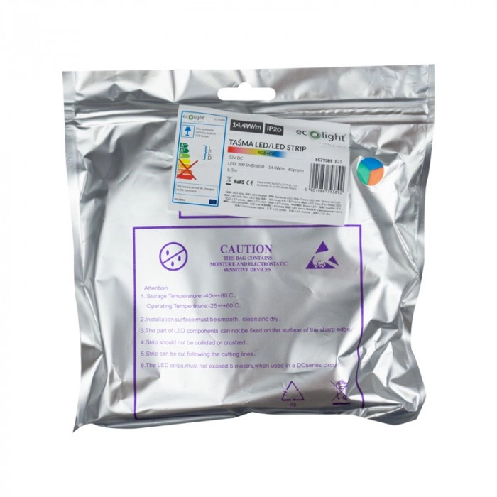 - Energetická účinnost: LED pásek Ecolight spotřebuje pouze 14,4 W na metr, což umožňuje výraznou úsporu energie při zachování plného jasu.